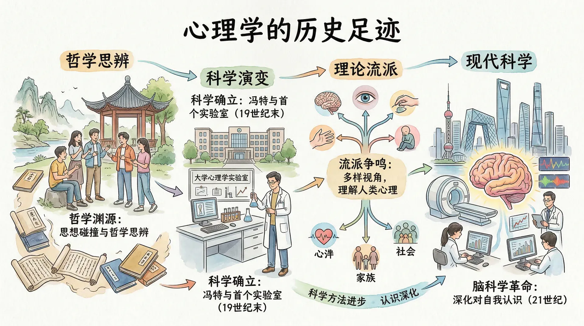 心理学虽然有着悠久的哲学根源,但作为一门独立的实验科学,其历史仅有150多年。这段相对较短但异常丰富的发展历程,见证了人类对“心理”这一神秘现象认识的不断深化。