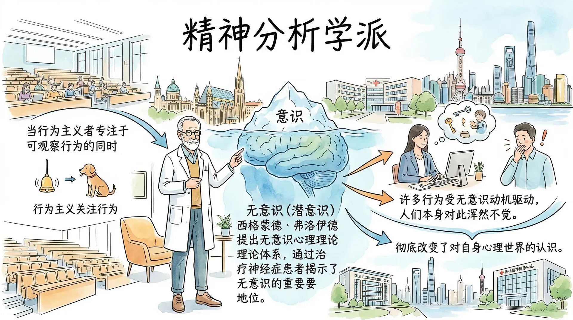 当行为主义者专注于可观察行为的同时,在欧洲的维也纳,一位医生的工作正在开辟心理学研究的另一片天地。西格蒙德·弗洛伊德通过对神经症患者的治疗,提出了一套关于无意识心理的理论体系,彻底改变了人们对自身心理世界的认识。弗洛伊德的最大贡献在于揭示了无意识在人类心理生活中的重要地位——在他之前,人们普遍认为意识是心理活动的全部,但弗洛伊德通过大量临床观察发现,人类的许多行为都受到无意识动机的驱动,而当事人本身对此浑然不觉。