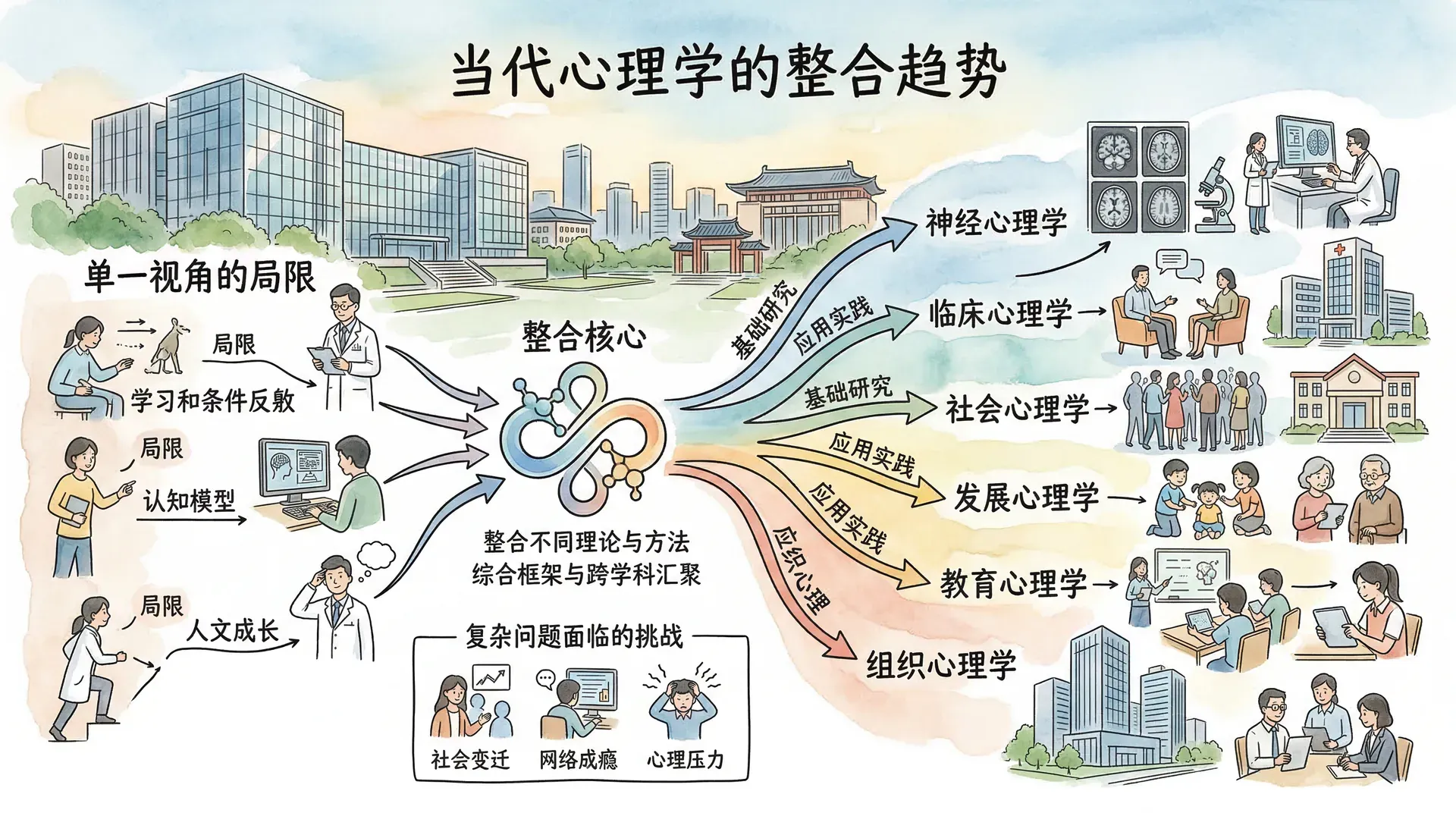 进入21世纪,心理学已经发展成为一个庞大而复杂的学科体系,从最初的几个主要流派,发展出了数十个专业分支,涵盖了从基础研究到应用实践的各个方面。随着研究的深入和社会需求的变化,心理学界越来越认识到单一理论视角的局限性,整合不同理论和方法成为当代心理学发展的重要趋势。现代心理学面临的问题往往异常复杂,任何单一视角都无法提供全面的解释,这促使心理学家寻求能够整合多种理论的综合框架。