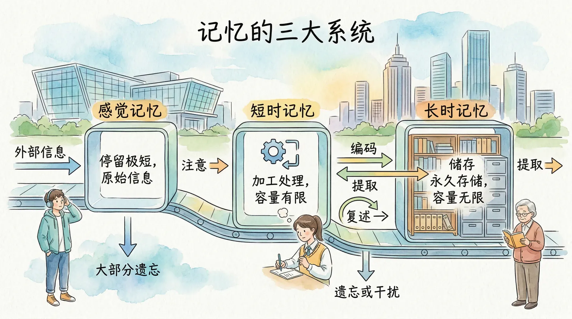 心理学家根据信息在大脑中停留的时间和加工方式,将记忆划分为感觉记忆、短时记忆和长时记忆三个系统。三者如同一条多级筛选流水线,各自承担不同的功能,共同完成信息的接收、处理与保存。