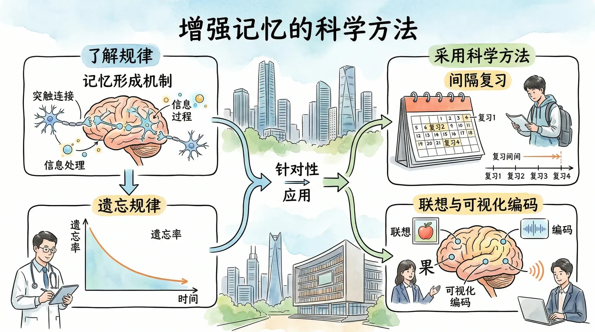 了解了记忆的形成机制和遗忘的规律,就可以有针对性地采用科学方法来提升记忆效果。以下几种方法都有扎实的研究支撑,在大量实践检验中也得到了证实。