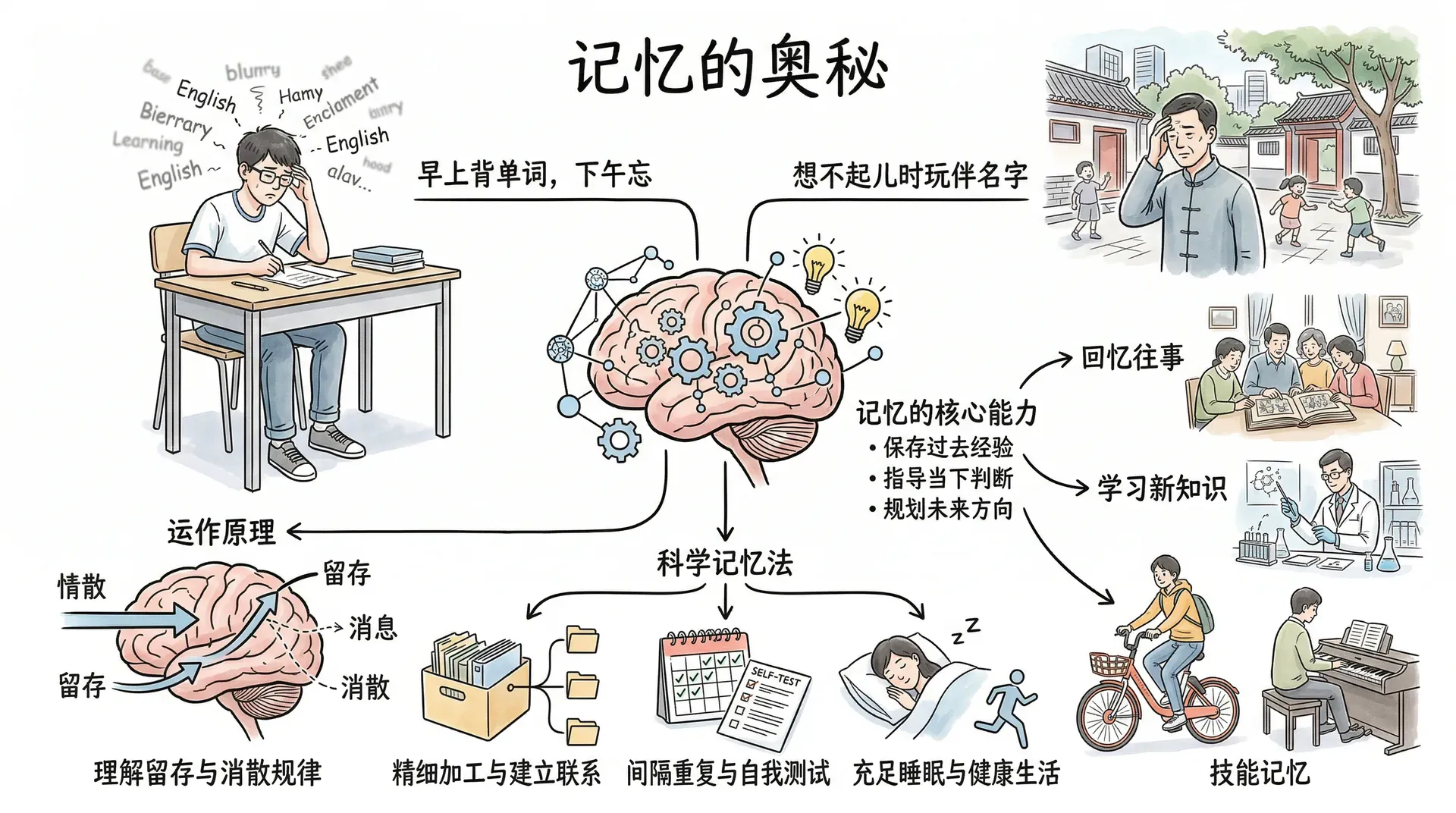 早上背了一个小时的英语单词,下午回头看,脑子里几乎一片空白;儿时在胡同里玩耍的小伙伴叫什么名字,如今怎么也想不起来。这些让人懊恼的经历,背后隐藏着记忆运作的基本规律。记忆是人类认知系统中最核心的能力之一,它保存过去的经验,指导当下的判断,规划未来的方向。从学习新知识到回忆往事,从骑单车到弹奏乐器,记忆影响着我们生活的方方面面。理解记忆的运作原理,知道哪些内容容易留存、哪些内容容易消散,以及如何运用科学方法让记忆更牢固,对每个学习者来说都有切实的意义。