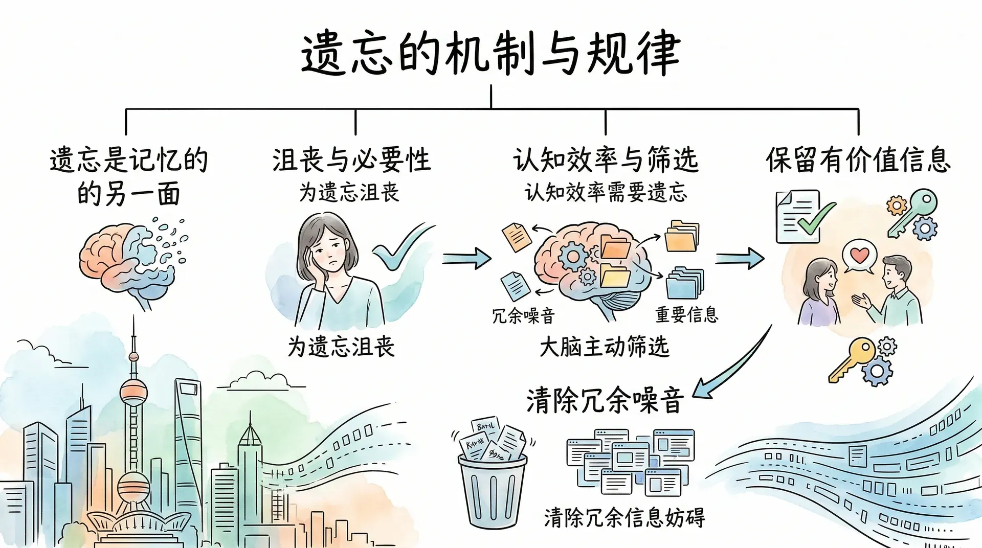 遗忘是记忆的另一面。虽然我们常常为遗忘感到沮丧,但从认知效率的角度看,遗忘本身也有其必要性。大脑并不需要保留所有的信息,如果每一次对话、每一个细节都原封不动地留存下来,大量无用的内容会占据认知资源,反而妨碍我们处理真正重要的事情。遗忘是大脑的一种主动筛选机制,帮助我们保留有价值的信息,清除冗余的噪音。