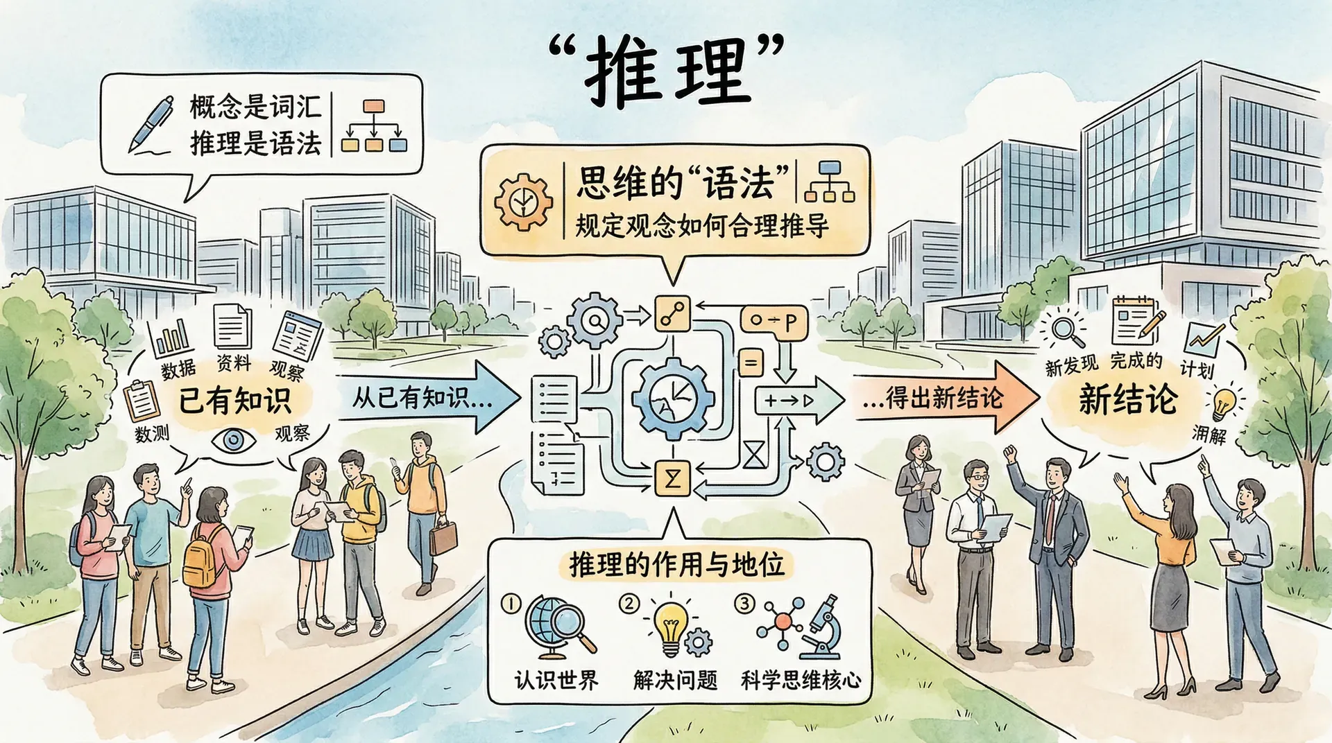 推理是从已有知识得出新结论的思维过程。如果说概念是思维的“词汇”,那么推理就是思维的“语法”——它规定了如何从一些观念合理地推导出另一些观念。推理是人类认识世界、解决问题的重要工具,也是科学思维的核心能力。