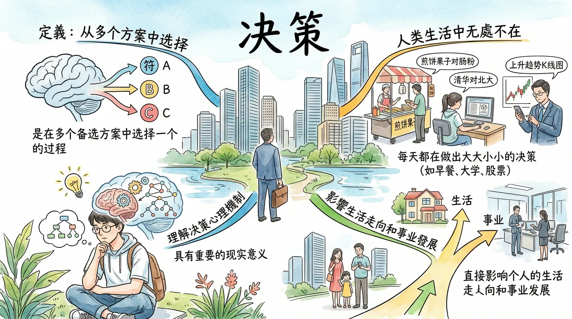 决策是在多个备选方案中选择一个的过程,是人类生活中无处不在的心理活动。从早餐吃什么,到选择哪所大学,再到是否购买某只股票,人们每天都在做出大大小小的决策。决策质量的高低,直接影响着个人的生活走向和事业发展,因此理解决策背后的心理机制,具有重要的现实意义。