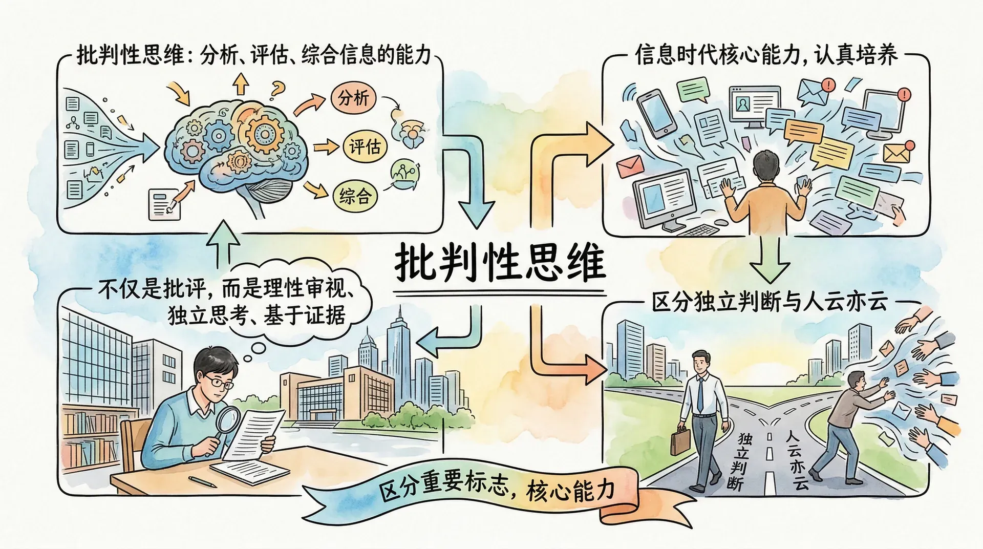 批判性思维是对信息和观点进行分析、评估和综合的能力。它不是批评一切,而是理性审视、独立思考、基于证据得出结论。在信息爆炸的时代,批判性思维是每个人都需要认真培养的核心能力,也是区分“人云亦云”与“独立判断”的重要标志。