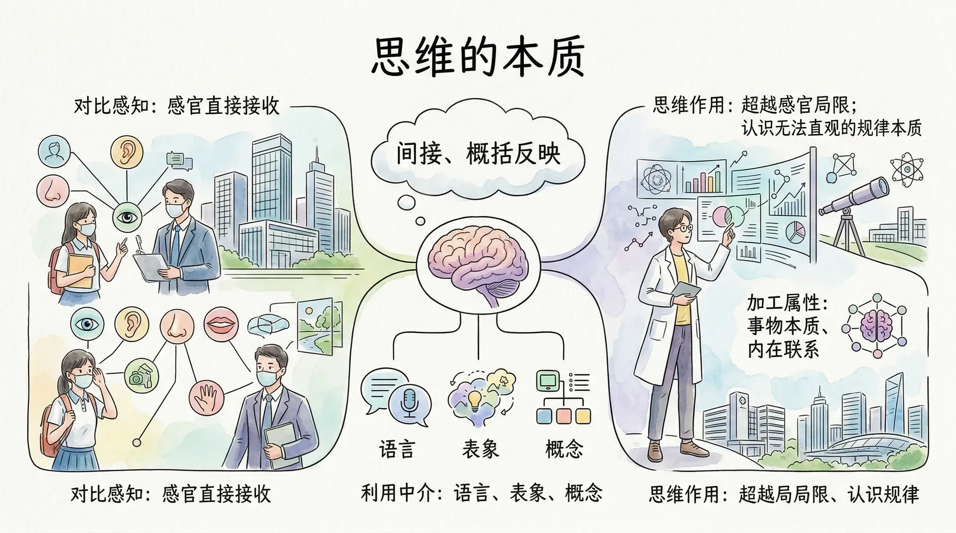 思维是人脑对客观事物间接的、概括的反映。与感知不同,思维不直接作用于感觉器官,而是通过语言、表象和概念等中介,对事物的本质属性和内在联系进行加工和认识。正因如此,思维能够帮助人类超越感官的局限,认识那些无法直接观察到的规律和本质。
