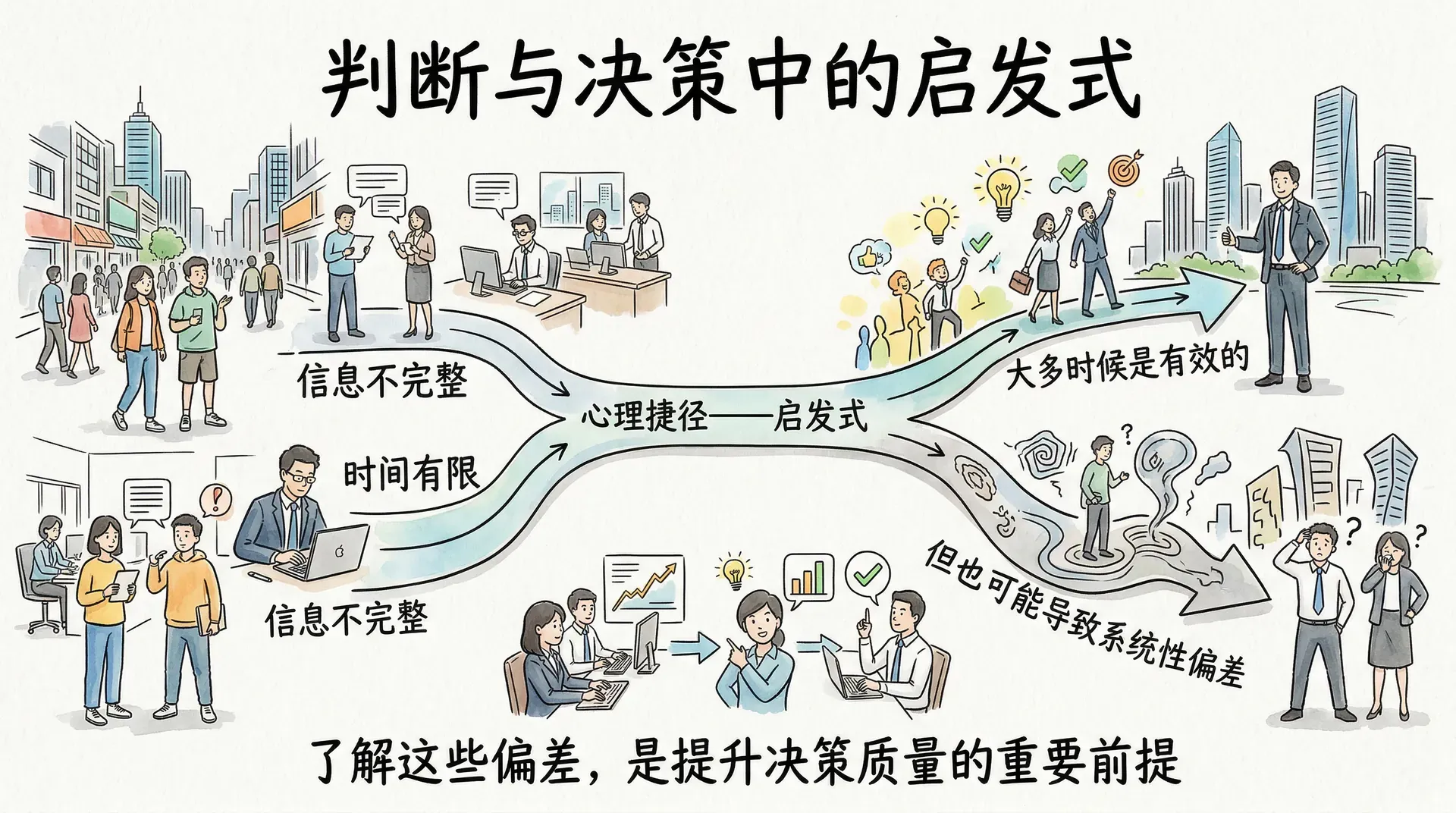 在信息不完整、时间有限的情况下,人们常常依赖心理捷径——启发式——来快速做出判断和决策。启发式大多数时候是有效的,但也可能导致系统性偏差。了解这些偏差,是提升决策质量的重要前提。
