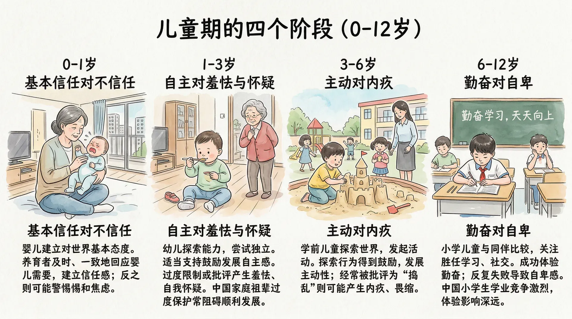 第四阶段为勤奋对自卑,约在6到12岁。小学阶段的儿童开始将自己与同伴比较,关注自己能否胜任学习和社交任务。成功体验培养勤奋感,反复失败则导致自卑感。中国小学生面临的学业竞争尤为激烈,这一阶段的体验对其后续发展影响深远。