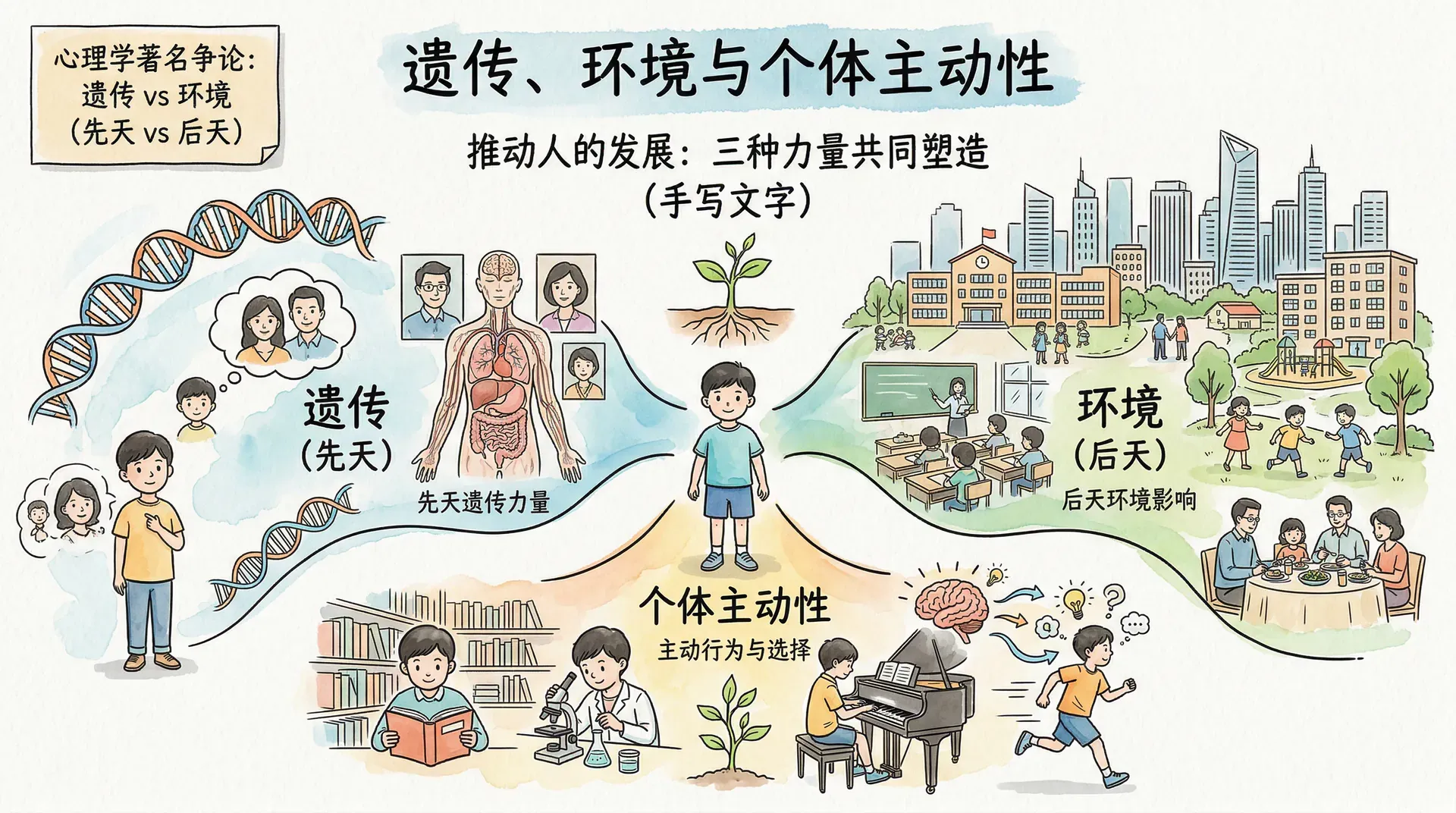 什么力量推动着人的发展?这个问题曾引发心理学史上最著名的争论——先天还是后天,遗传还是环境。今天我们知道,这不是非此即彼的问题,三种力量共同塑造着每一个独特的个体。