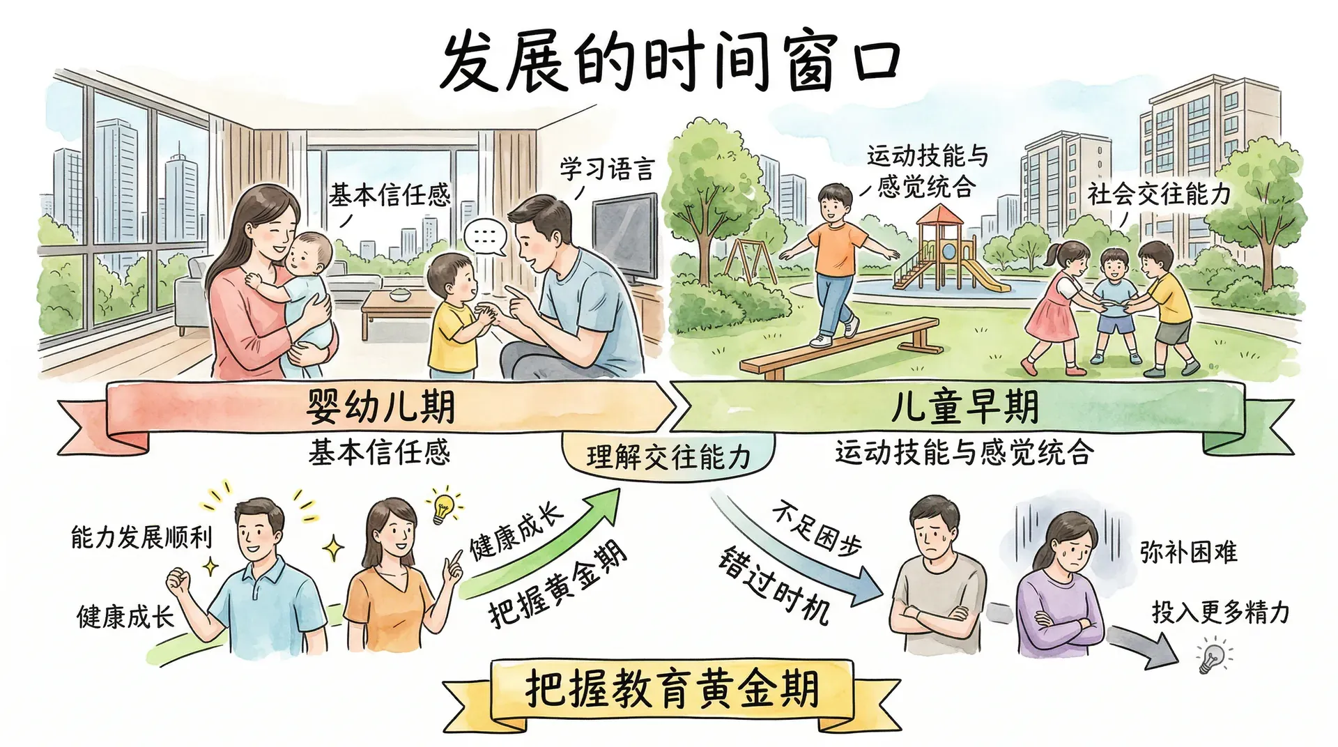 如果在这些关键时期得到了适当的刺激和支持,能力的发展会更加顺利、高效;而如果错过了这些重要时机,再想弥补就会变得非常困难,往往需要投入更多的时间和精力,甚至可能永远无法完全达到正常水平。因此,理解发展的时间窗口,有助于我们把握教育和养育的“黄金期”,为个体的健康成长创造更有利的条件。