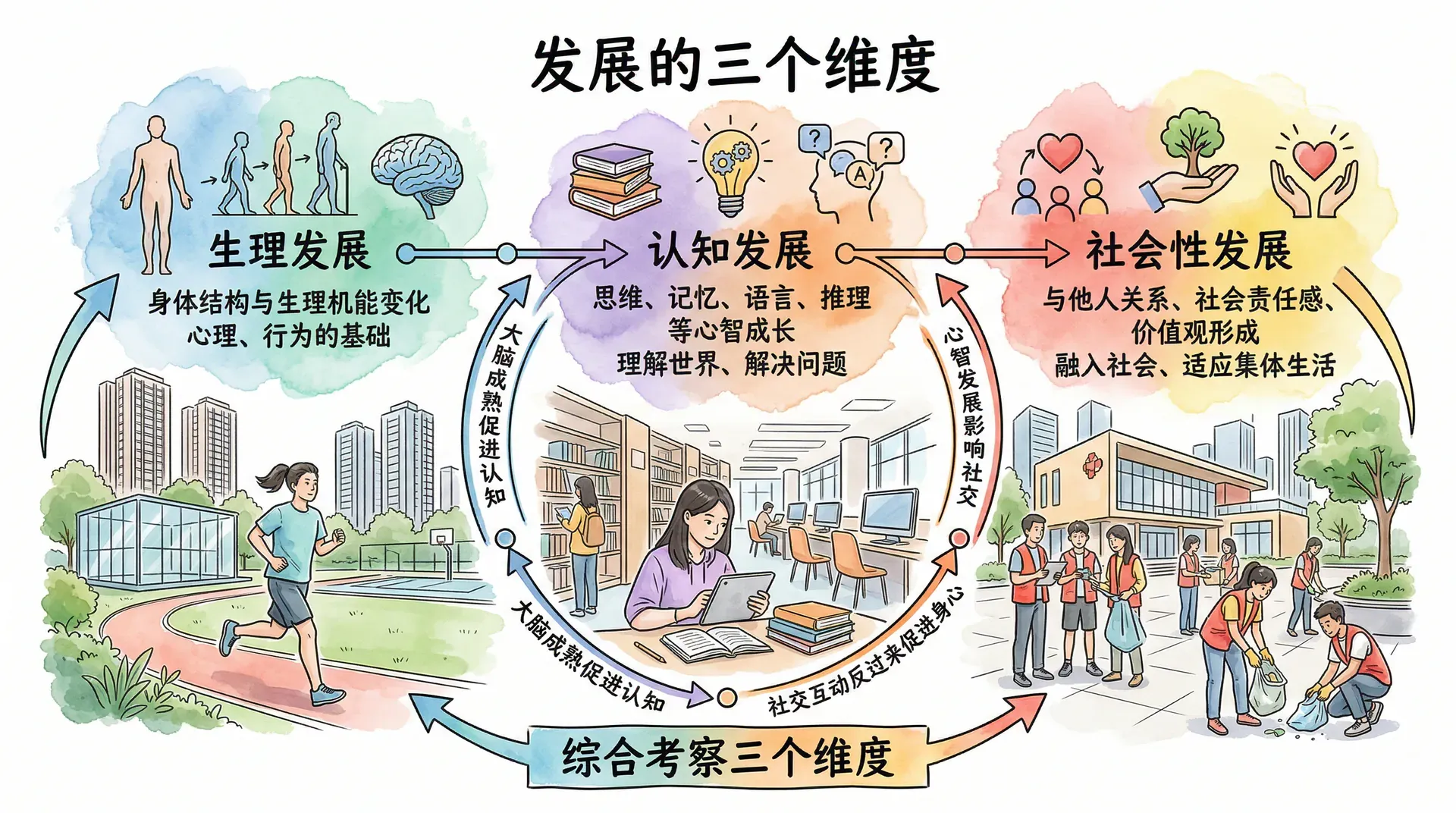 这三个维度在每个人的成长过程中相互作用,比如,大脑的生理成熟为认知能力的提升提供条件,而认知能力的发展又影响个体的社会交往能力,丰富的社会互动又反过来促进大脑和心理的发展。因此,完整理解人的发展,必须综合考察这三个维度,缺一不可。