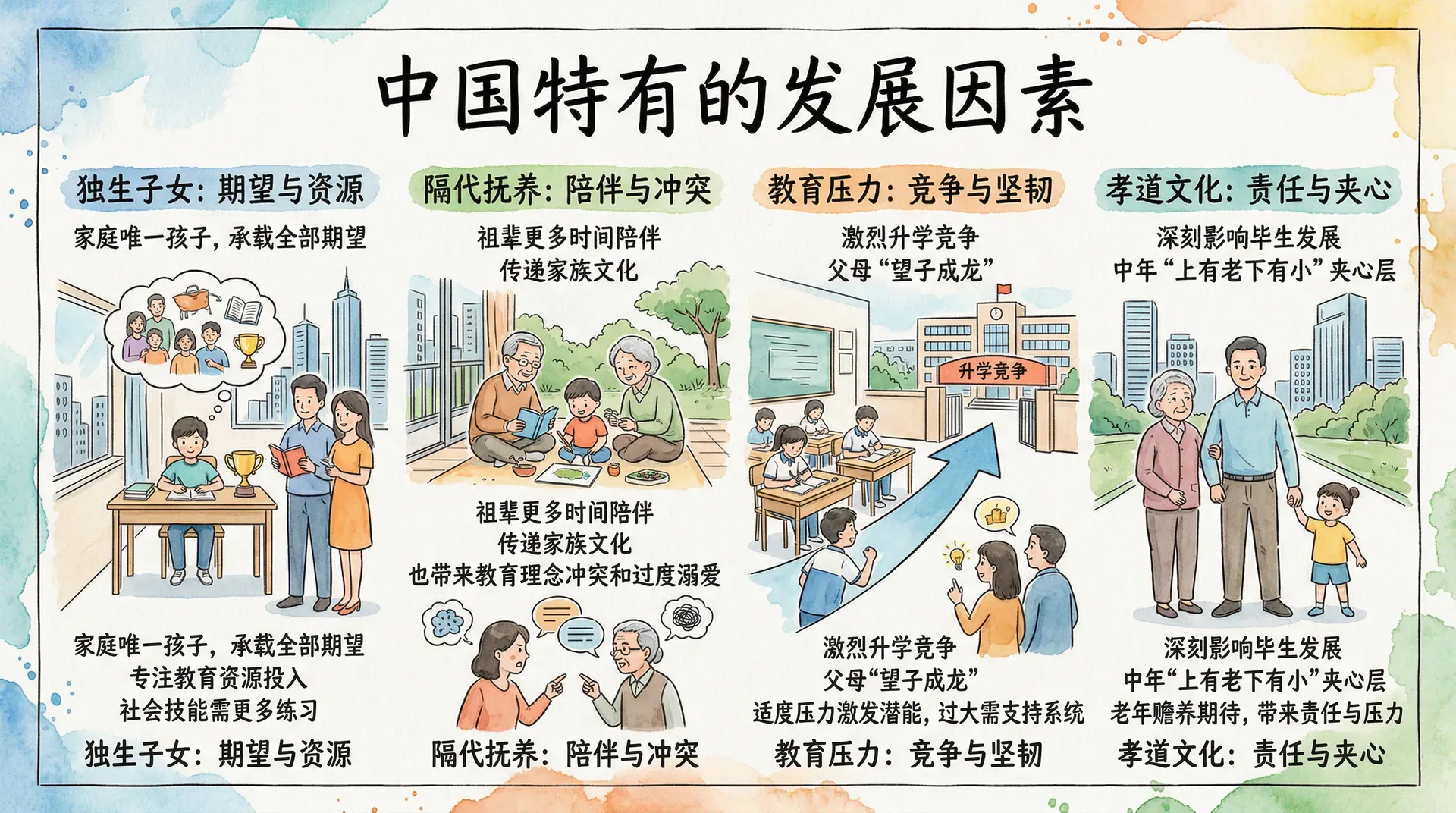 将这些理论应用于中国情境时,需要考虑文化背景的独特性。独生子女、隔代抚养、教育竞争、孝道文化等因素,塑造着中国儿童青少年独特的发展轨迹。