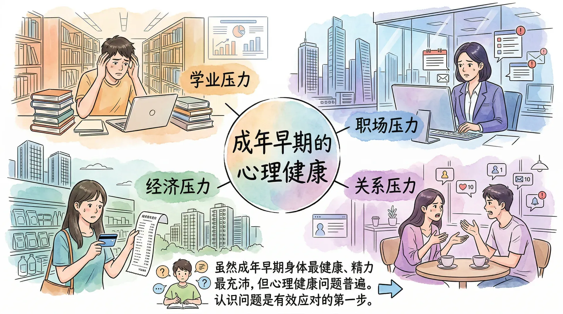 虽然成年早期是身体最健康、精力最充沛的人生阶段,但心理健康问题在这一时期却相当普遍。学业压力、职场压力、经济压力与关系压力相互叠加,让许多年轻人处于长期的心理紧绷状态。认识这一阶段常见的心理健康问题,是有效应对的第一步。