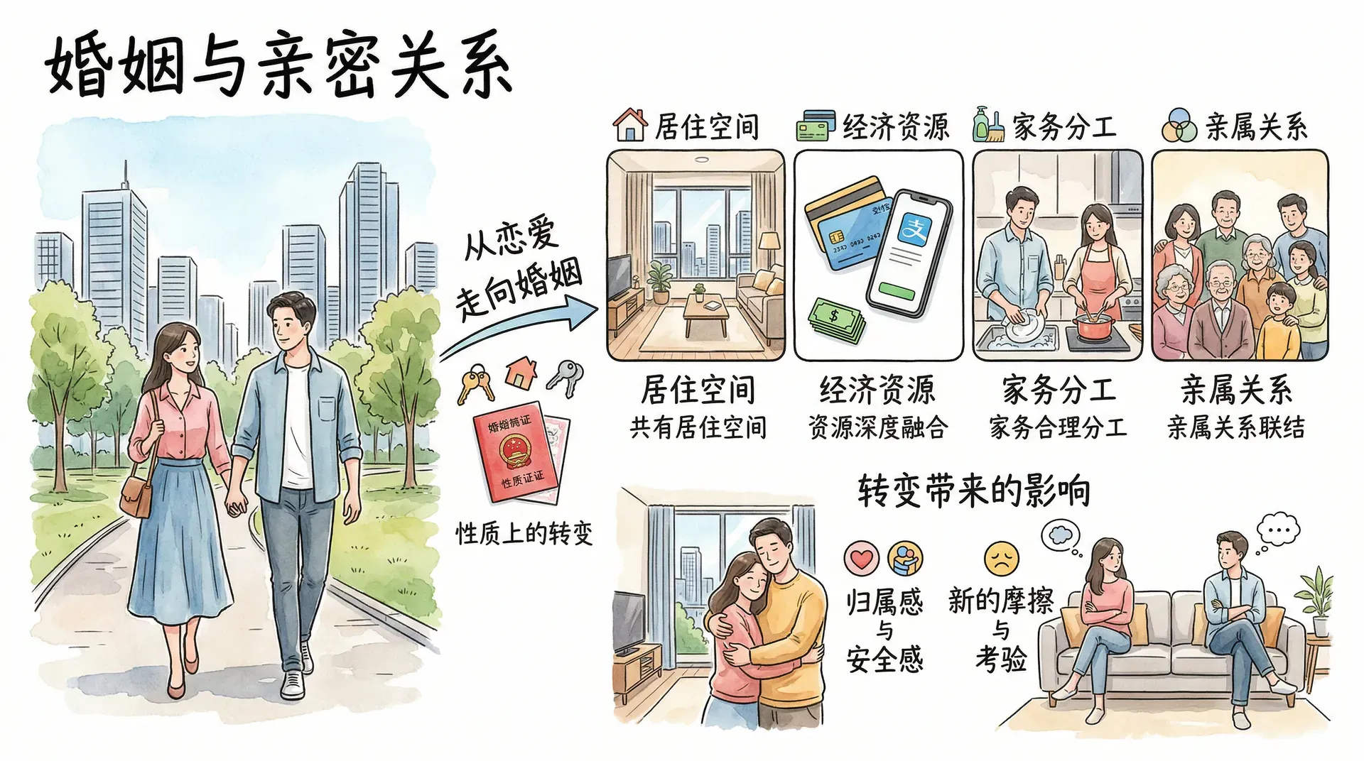 从恋爱走向婚姻,亲密关系发生了性质上的转变。两个人不再只是情感上的伴侣,还成为共同生活的合作者,在居住空间、经济资源、家务分工、亲属关系等各个层面深度融合。这种转变既带来了归属感和安全感,也带来了新的摩擦和考验。