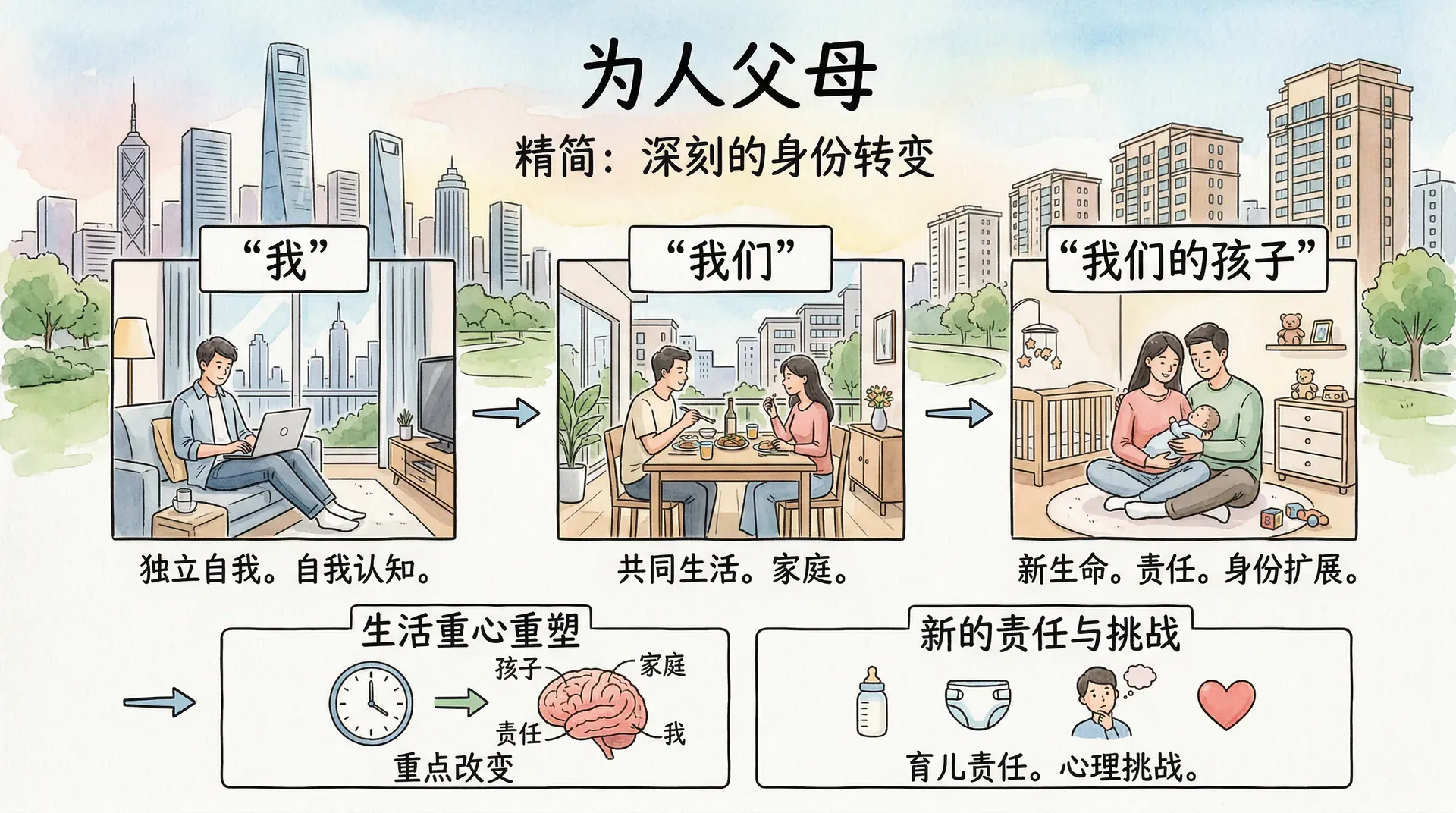 对于许多人来说,成为父母是成年早期最深刻的身份转变。一个新生命的到来,不仅改变了家庭结构,也从根本上重塑了父母的自我认知和生活重心。从“我”到“我们”,再到“我们的孩子”,每一次身份的扩展都带来新的责任和心理挑战。