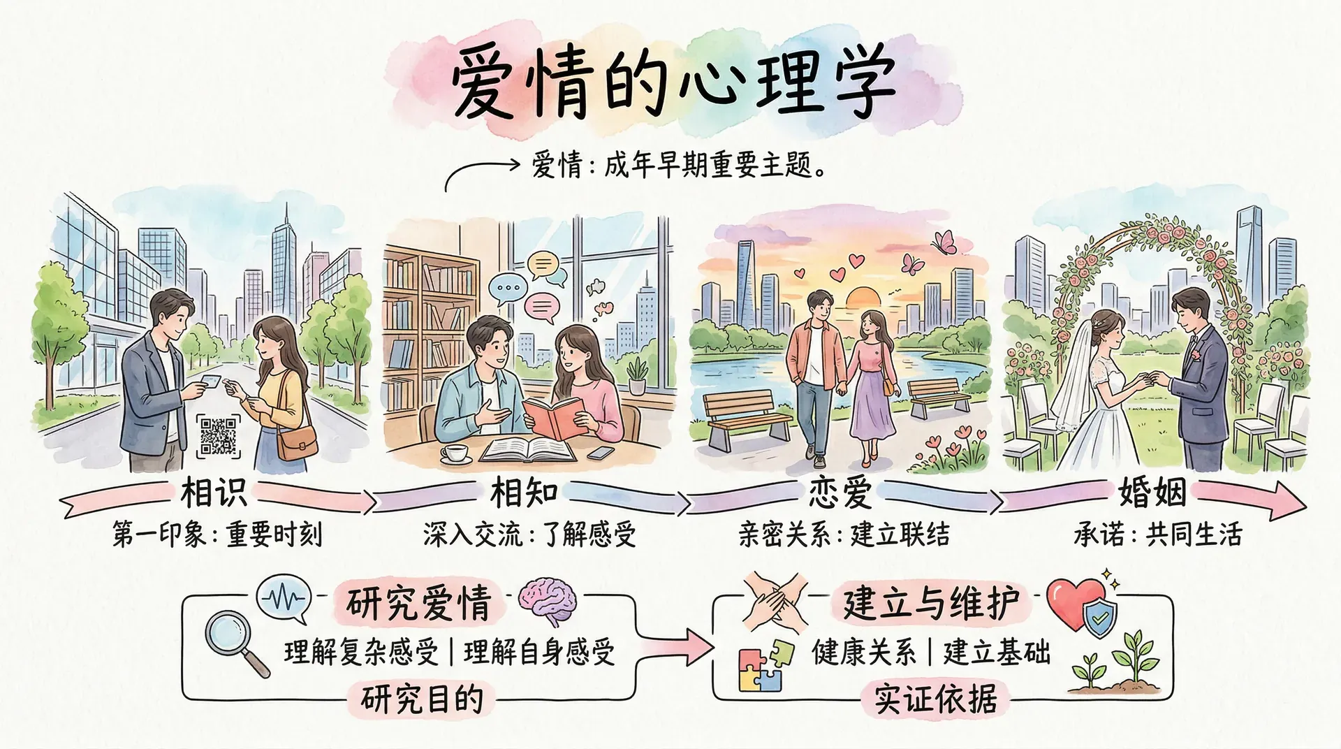 爱情是成年早期最重要的主题之一。从相识到相知,从恋爱到婚姻,亲密关系的发展遵循着一定的心理规律。心理学对爱情的研究不仅帮助我们理解那些难以言说的感受,也为如何建立和维护健康的亲密关系提供了实证依据。