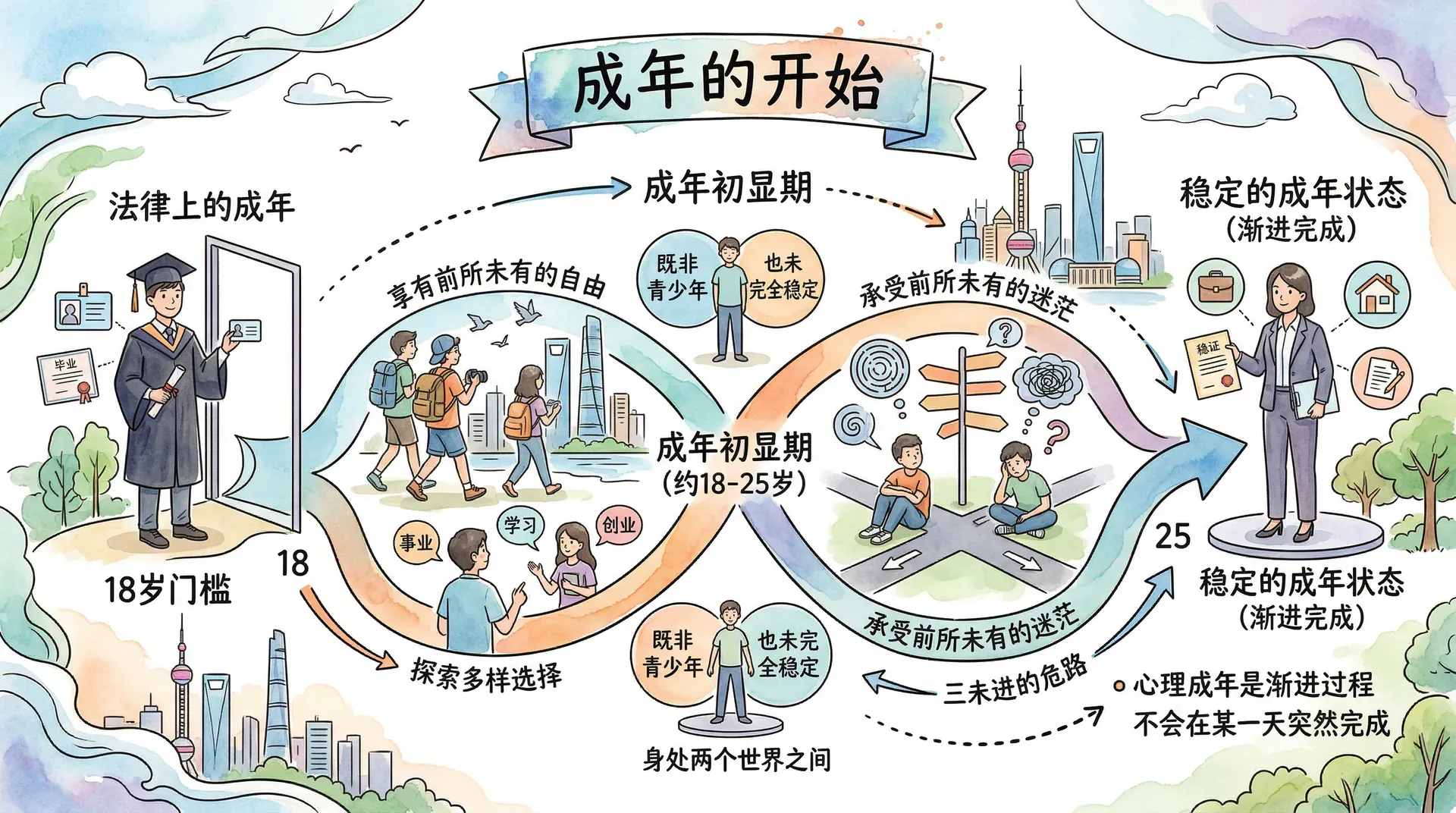 跨过18岁的门槛,法律上已是成年人,但心理上的成年却是一个渐进的过程,不会在某一天突然完成。现代社会中,越来越多的年轻人经历着一段被称为“成年初显期”的特殊过渡阶段,大约从18岁延续到25岁。处于这一阶段的人既不再是青少年,也还未完全进入稳定的成年状态,他们身处两个世界之间,享有前所未有的自由,却也承受着前所未有的迷茫。