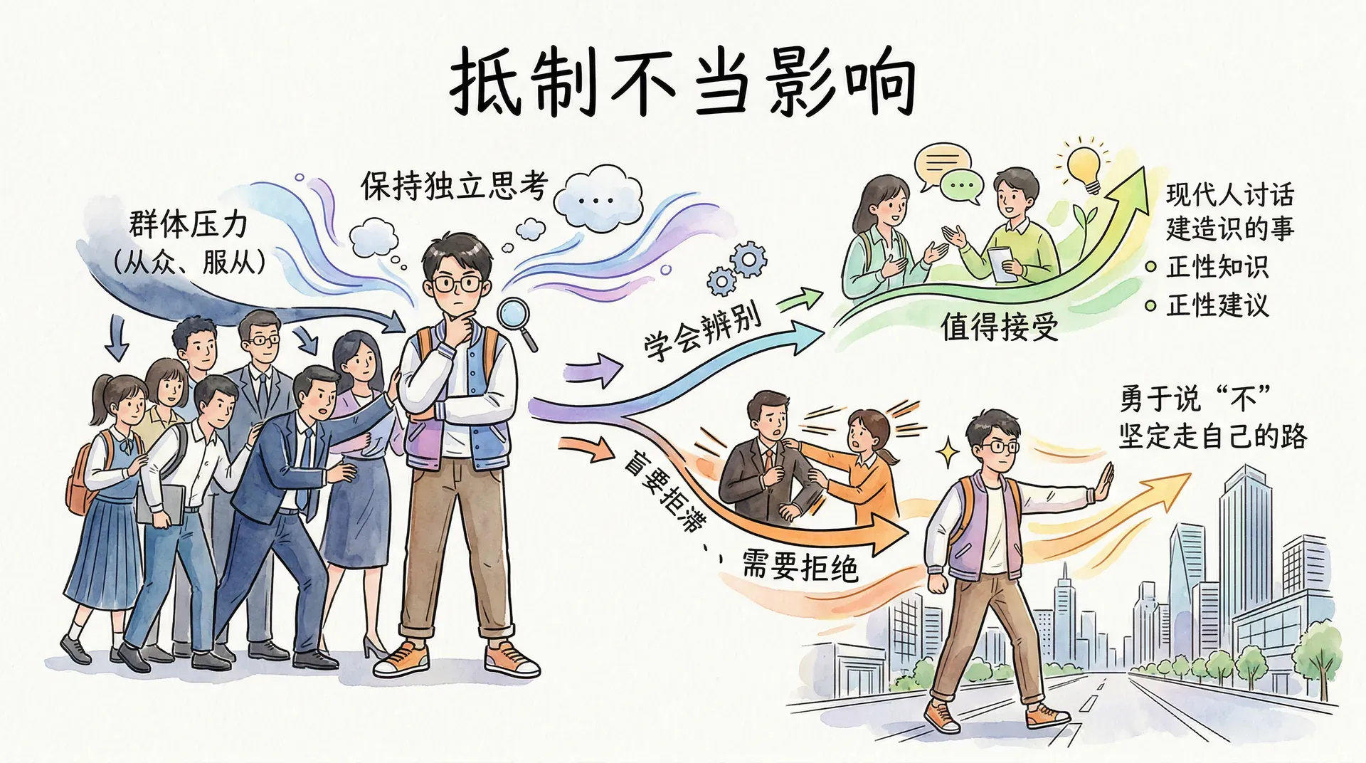 既然从众和服从的压力如此强大,我们如何才能保持独立思考,在必要时勇于说“不”?抵制不当影响并不意味着要成为一个固执的人,而是学会在群体压力中辨别哪些影响值得接受,哪些需要拒绝。