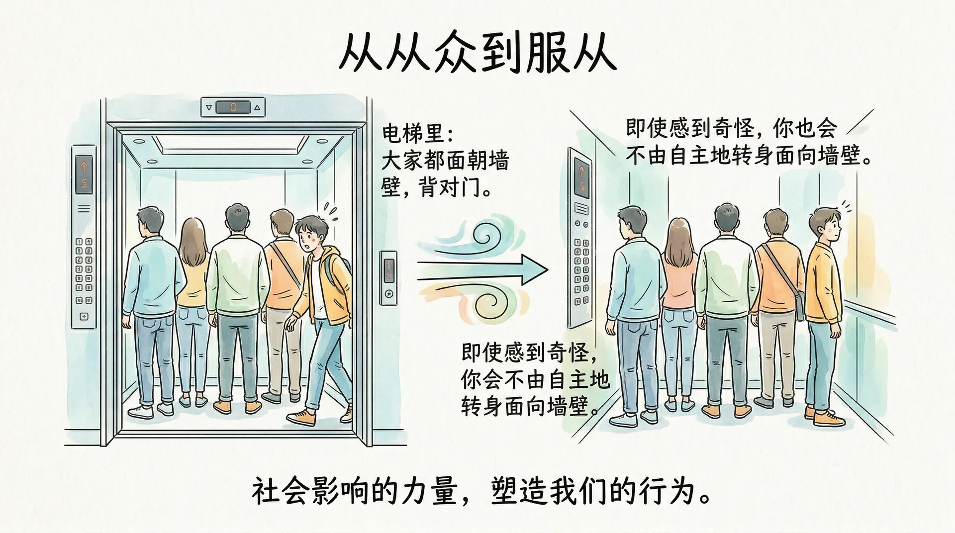 电梯里所有人都面朝墙壁站立,背对电梯门。此时走进的你会怎么做?多数人即使觉得奇怪,也会不由自主地转身面向墙壁。这正是社会影响的力量——它无时无刻不在塑造我们的行为和选择。