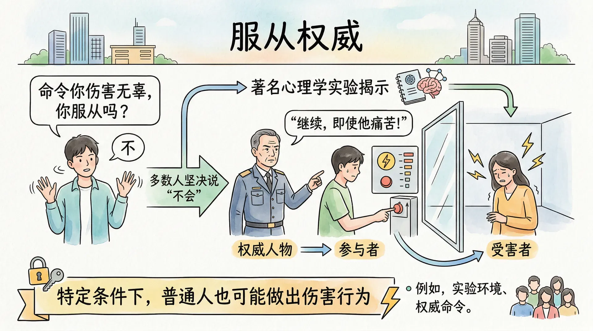 米尔格拉姆的研究表明,做出伤害行为的人不一定是心理变态的怪物,他们可能是普通人,只是在特定的社会情境和权威压力下,失去了独立判断的能力。这被称为“平庸的邪恶”——邪恶不一定源于恶魔般的本性,而可能源于不假思索的服从。