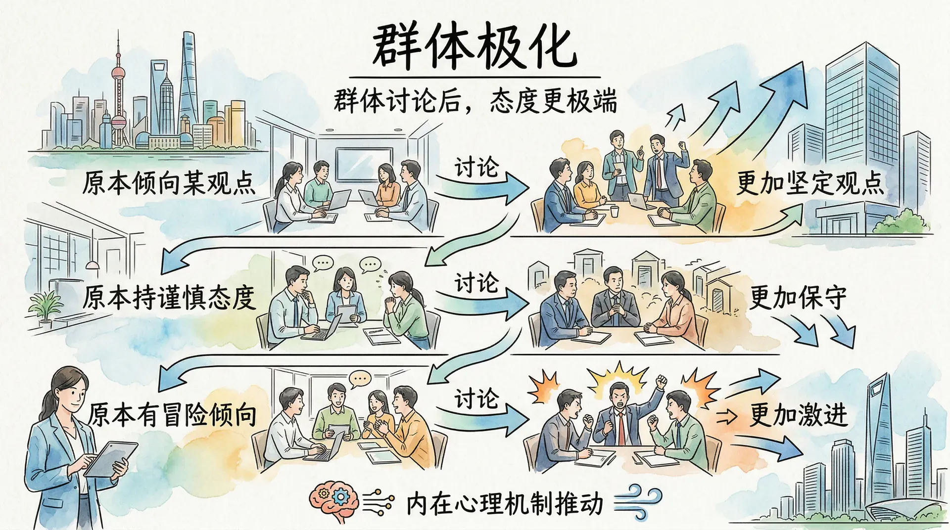 群体极化是指在群体讨论后,成员的态度会向更极端的方向发展。如果讨论前倾向于某个观点,讨论后会更加坚定;如果讨论前持谨慎态度,讨论后会更加保守;如果讨论前有冒险倾向,讨论后会更加激进。群体极化不是偶然的现象,它有其内在的心理机制。
