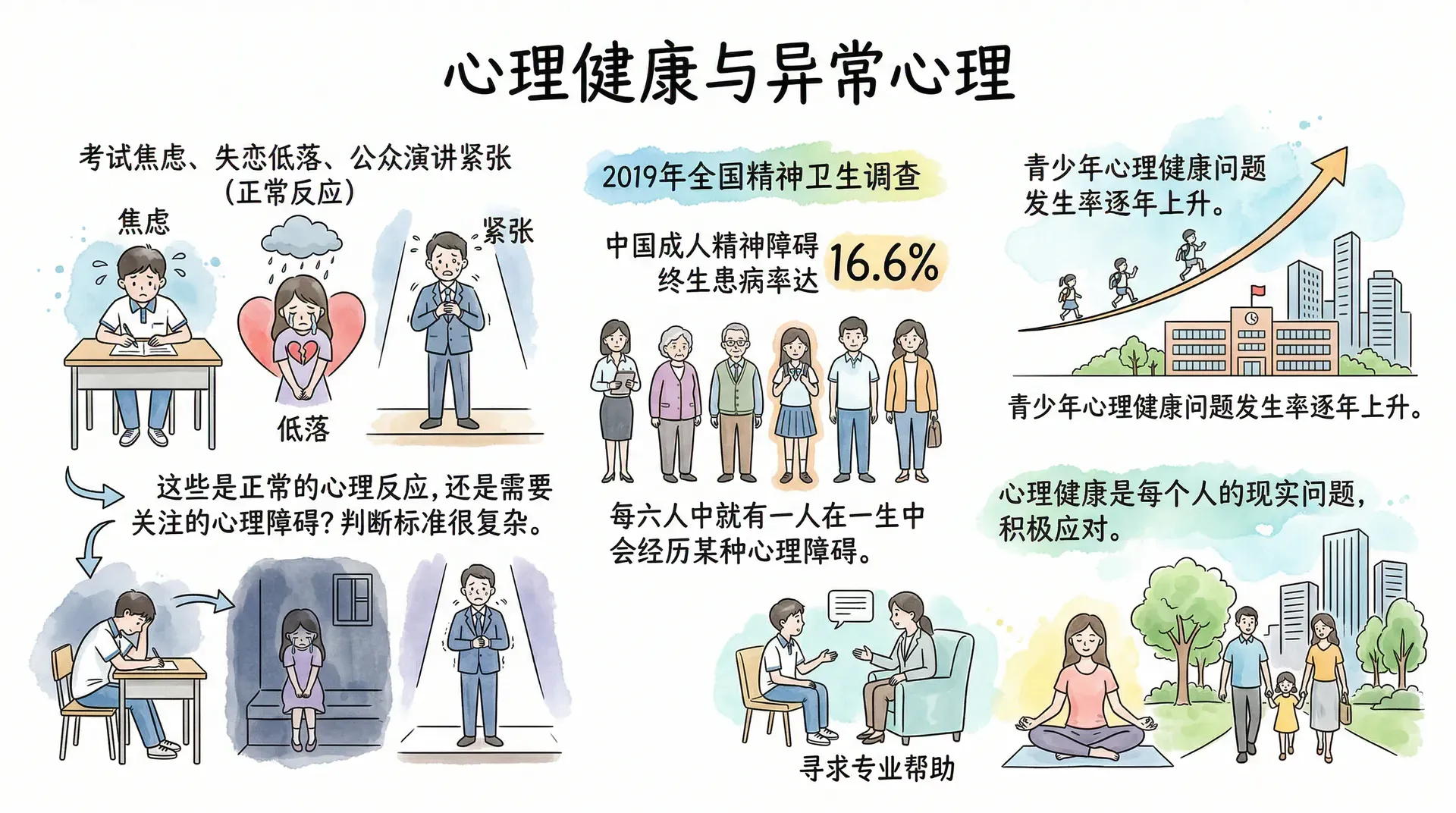 考试临近时的焦虑、失恋后数周的情绪低落、在公众场合说话时的紧张不安——这些究竟是正常的心理反应,还是需要关注的心理障碍?判断标准远比表面看起来复杂。2019年全国精神卫生调查显示,中国成人各类精神障碍的终生患病率达16.6%,每六人中就有一人在一生中会经历某种心理障碍。青少年群体的心理健康问题发生率也在逐年上升。这些数字说明,心理健康不是遥远的话题,而是每个人都可能面对的现实问题。