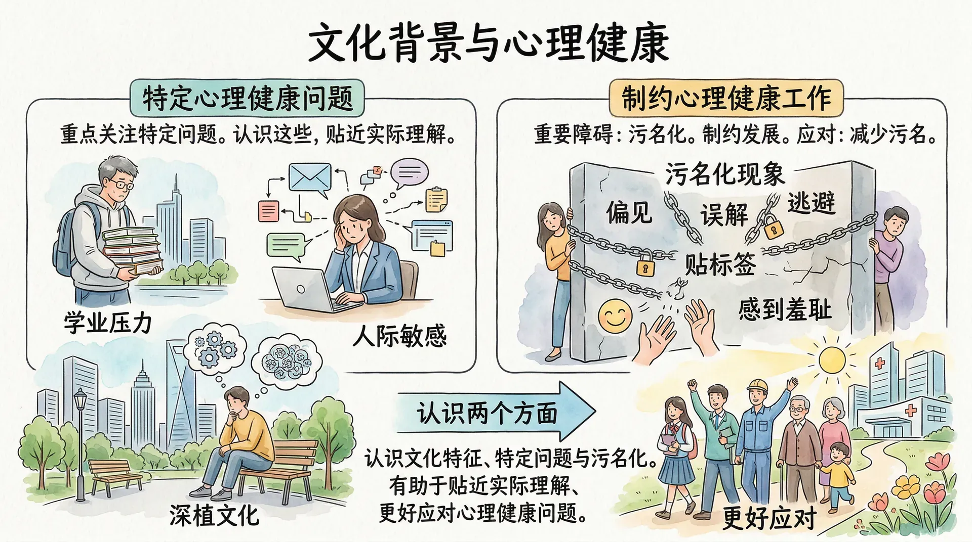 文化背景影响心理障碍的表现方式,中国文化中的躯体化倾向、神经衰弱现象和孝道压力,都是理解本土心理健康问题的重要线索。污名化阻碍患者求助和康复,减少偏见、提高认知、营造支持性的社会氛围至关重要。大多数心理障碍都是可以治疗的,尽早识别、及时求助、科学治疗,是通向康复的关键。