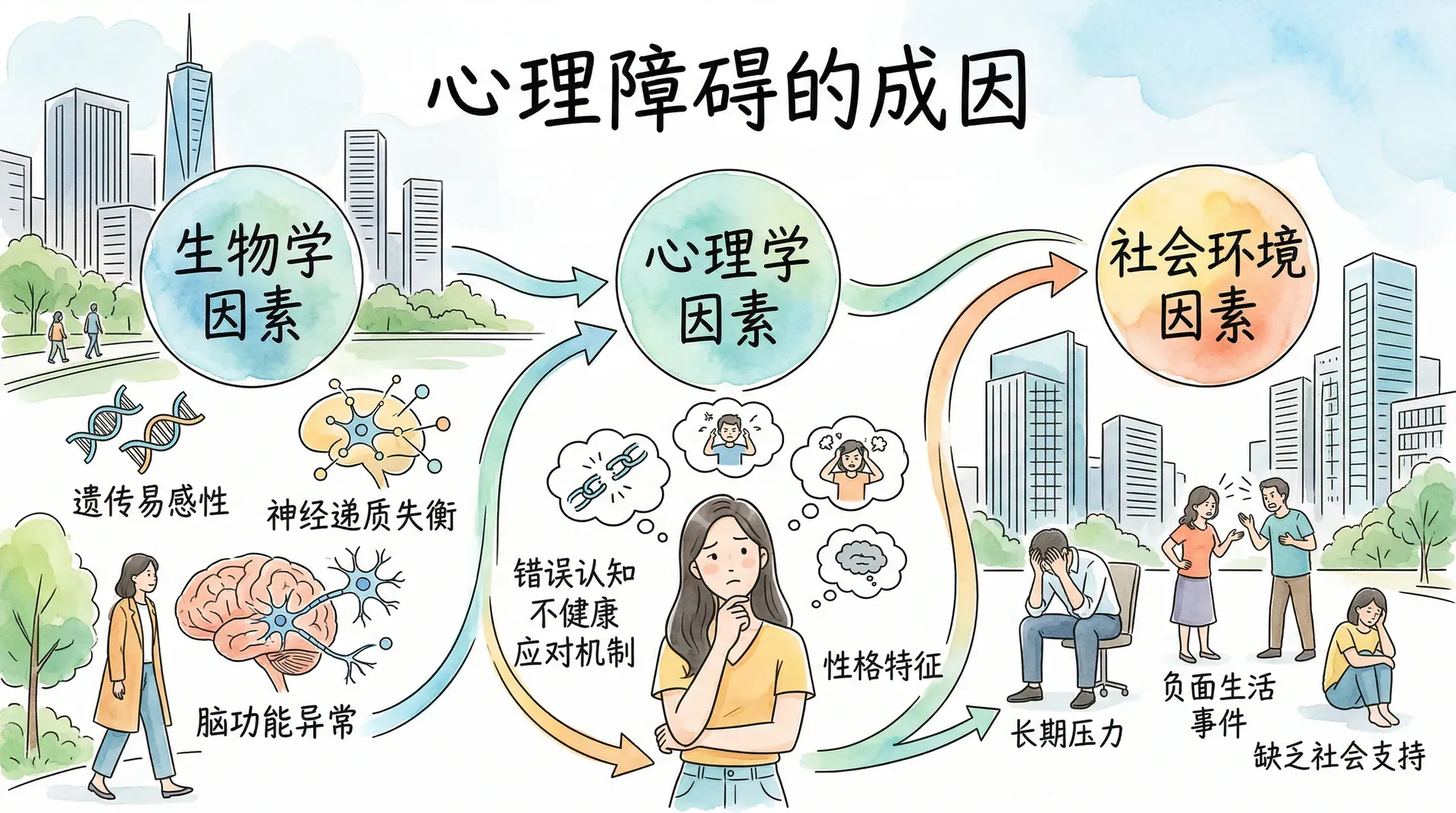 心理障碍的发生原因复杂,无法用单一因素解释。就像树木的生长需要种子、土壤、水分、阳光等多种因素共同作用,心理障碍的发生同样是多种因素交互作用的结果。目前学界最广泛接受的理论框架是生物-心理-社会模型,而素质-压力模型则进一步解释了为何不同个体面对相同压力会有截然不同的反应。
