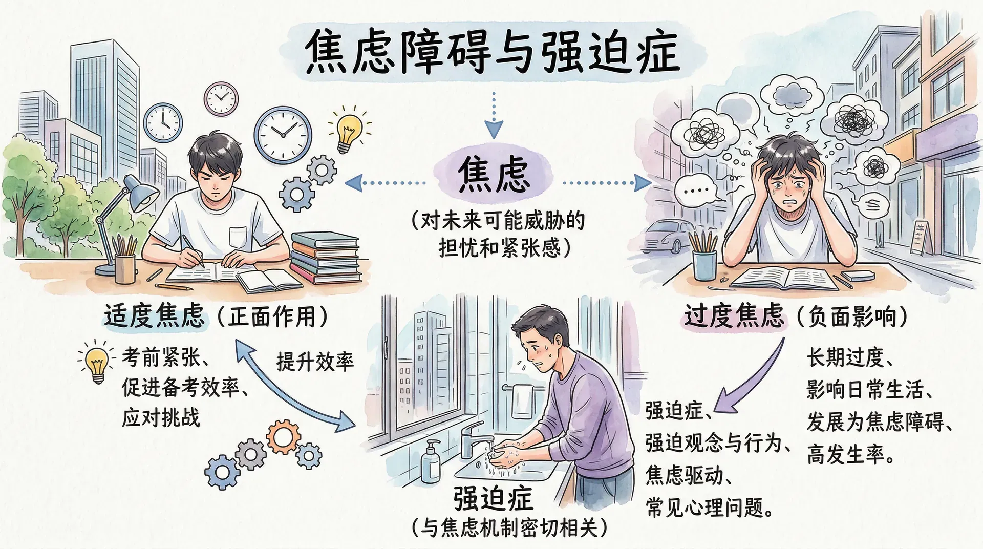 焦虑是对未来可能出现的威胁产生的担忧和紧张感。适度的焦虑有助于应对挑战,比如考前的适当紧张能促进备考效率;但若焦虑长期过度且影响日常生活,就可能发展为焦虑障碍。焦虑障碍是目前发生率最高的心理障碍类型之一,强迫症与焦虑机制密切相关,也是临床上较为常见的心理问题。