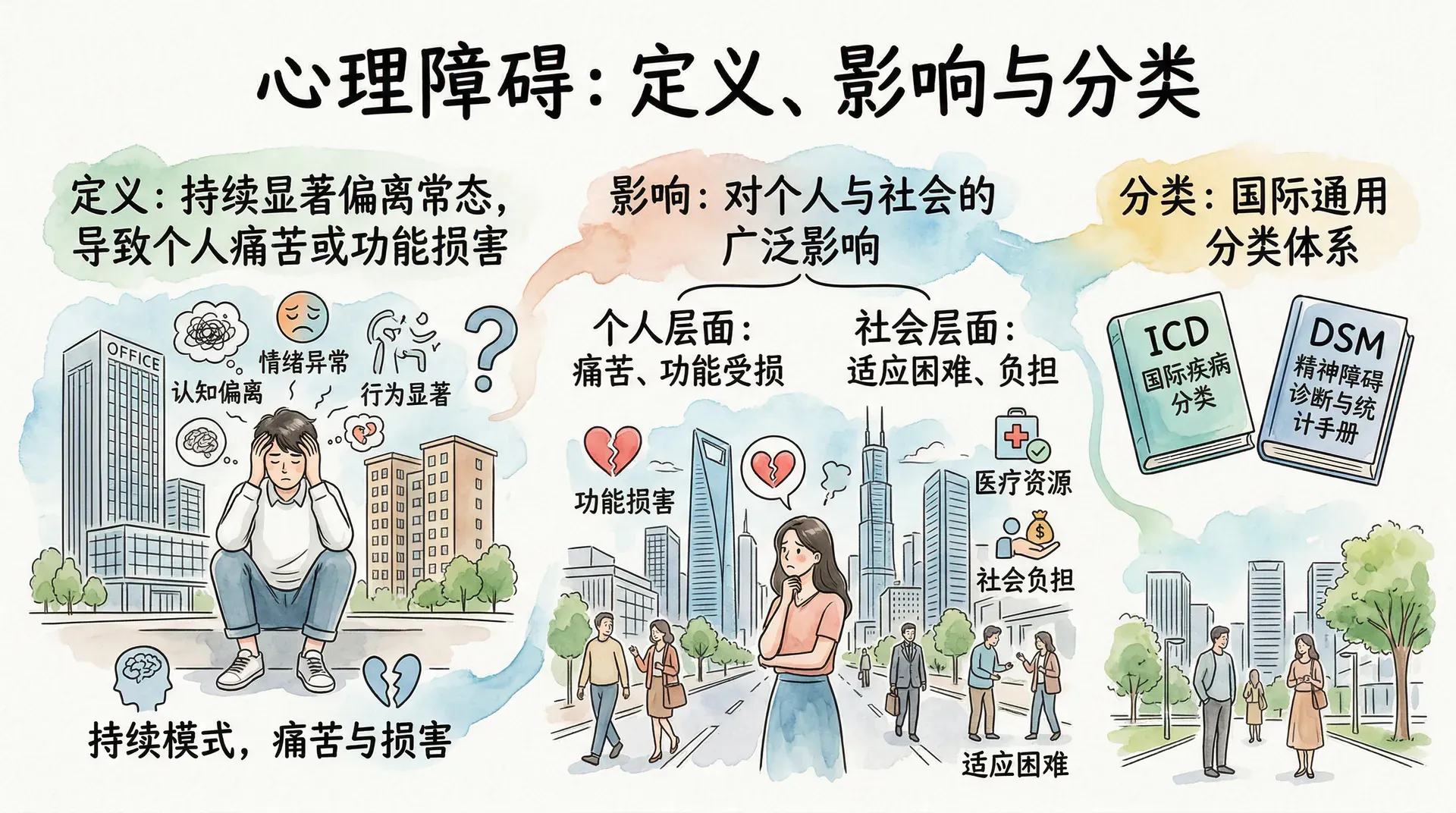 心理障碍,也称精神障碍,是指个体在认知、情绪、行为等方面出现持续的、显著偏离常态的模式,导致个人痛苦或功能损害。理解心理障碍,需要先明确其判断条件,再了解它对个人和社会的广泛影响,以及当前国际通用的分类体系。