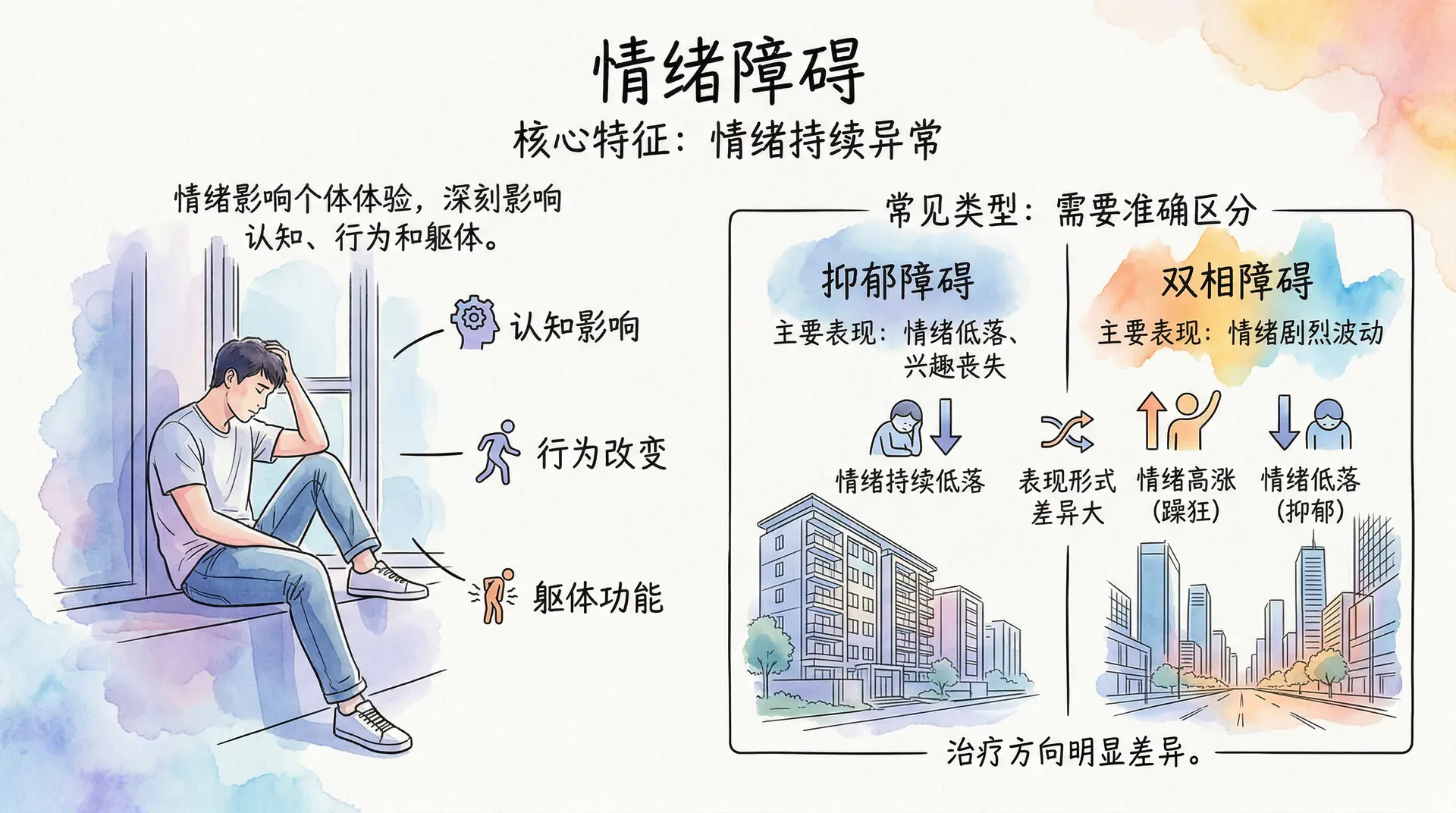 情绪障碍以情绪显著且持续的异常为主要特征,不仅影响个体的情绪体验,还深刻影响认知、行为和躯体功能。常见的情绪障碍包括抑郁障碍和双相障碍,两者虽然都以情绪问题为核心,但表现形式和治疗方向有着明显差异,需要准确区分。
