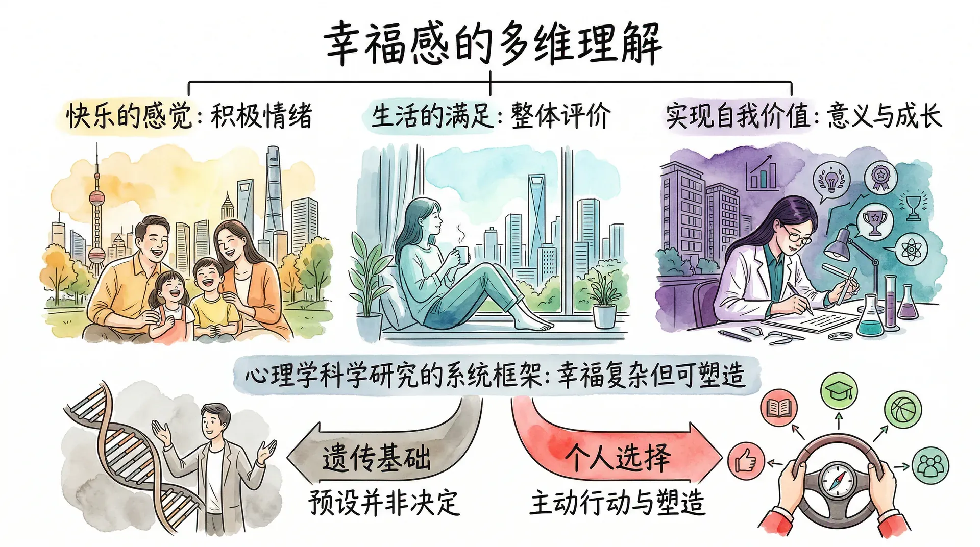 幸福感并非完全由外部环境决定。遗传因素约占50%,生活环境约占10%,而个人选择和行为约占40%。这意味着每个人都有相当大的空间,通过主动努力来提升自己的幸福感。
