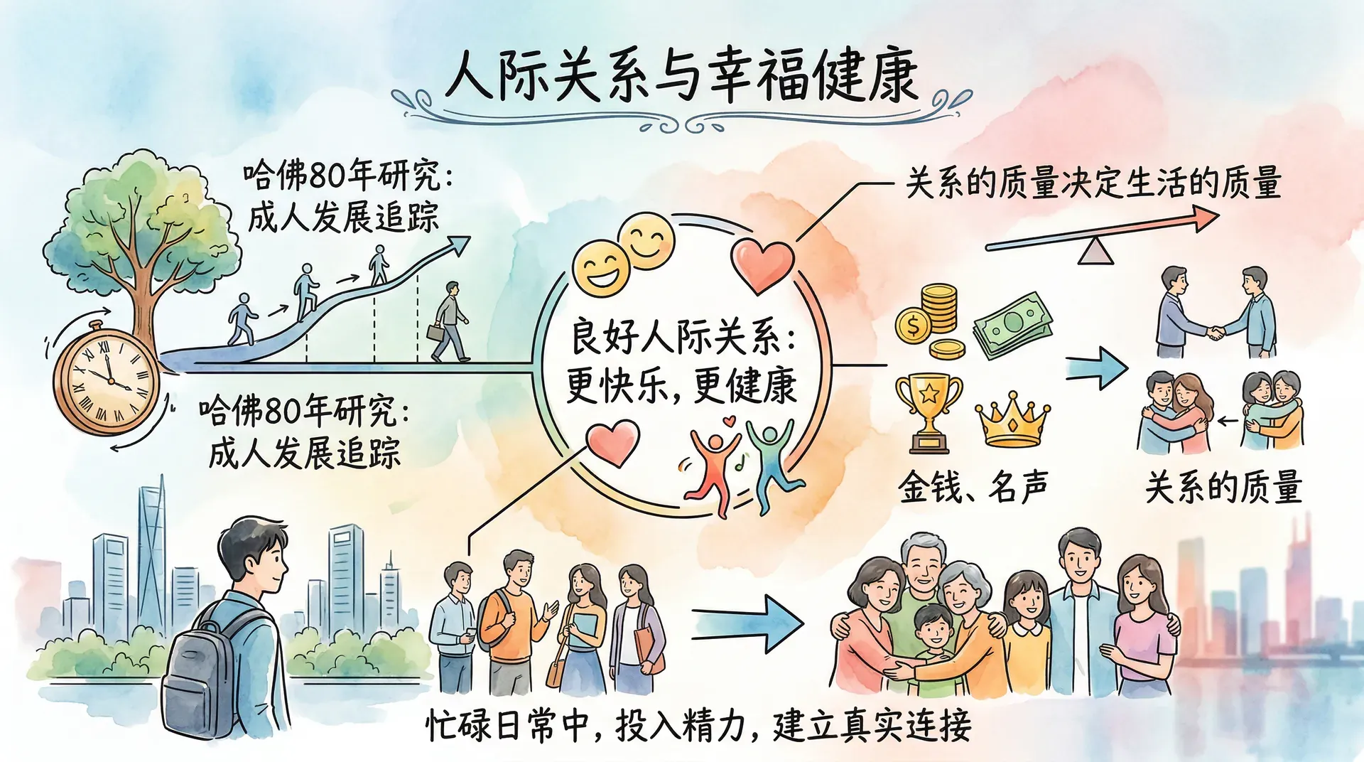 人际关系是幸福的重要来源。研究一致表明,拥有高质量社会关系的人更幸福、更健康,甚至寿命更长。人类是社会性动物,孤立无援的生活状态与各种心理和生理疾病密切相关。