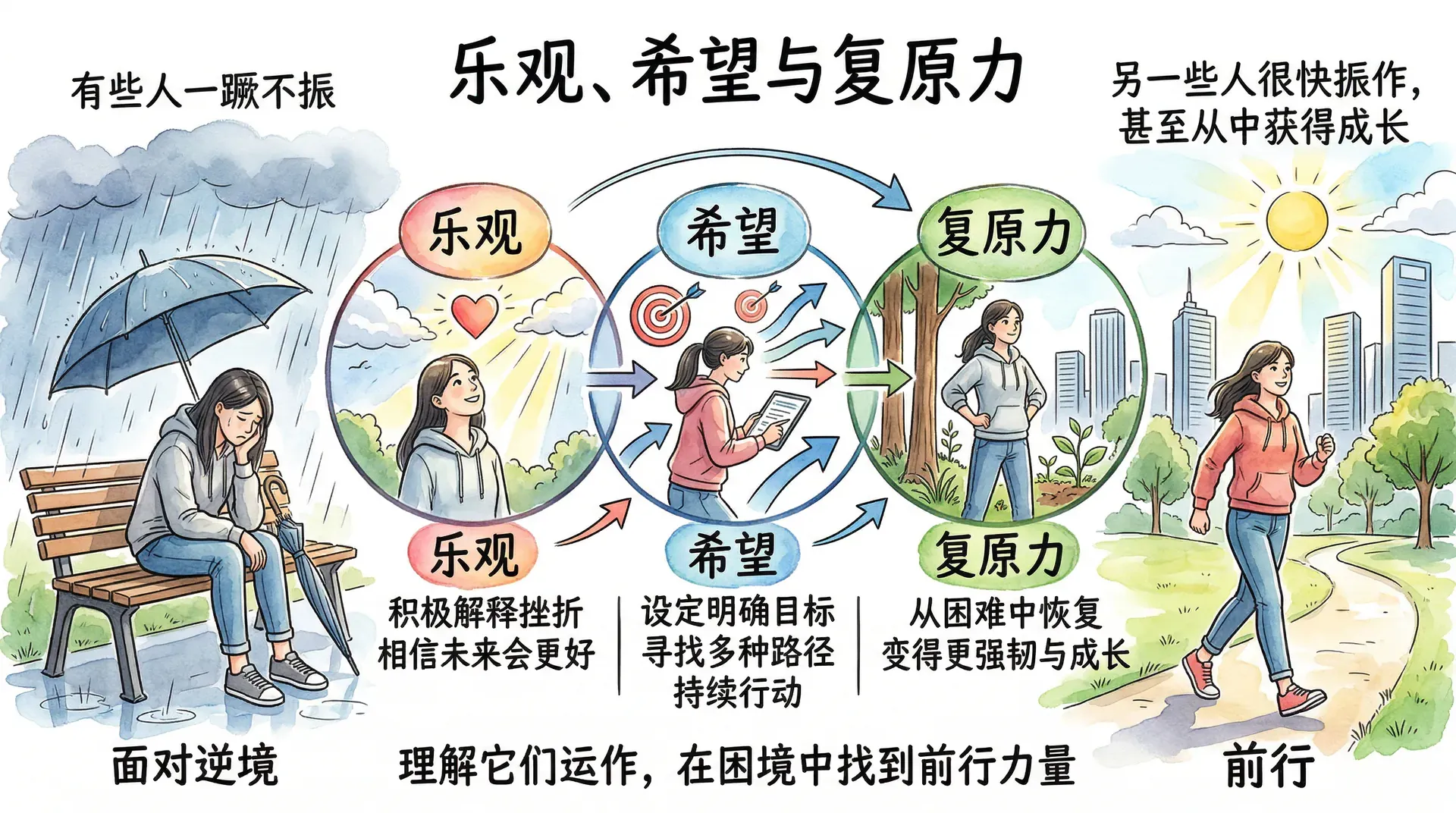 面对生活中的挫折和逆境,不同的人会表现出截然不同的反应。有些人在困难面前一蹶不振,另一些人却能很快振作,甚至从中获得成长。这种差异的背后,藏着乐观、希望与复原力这三种紧密相连的心理品质。理解它们的运作方式,有助于在困境中找到前行的方向。