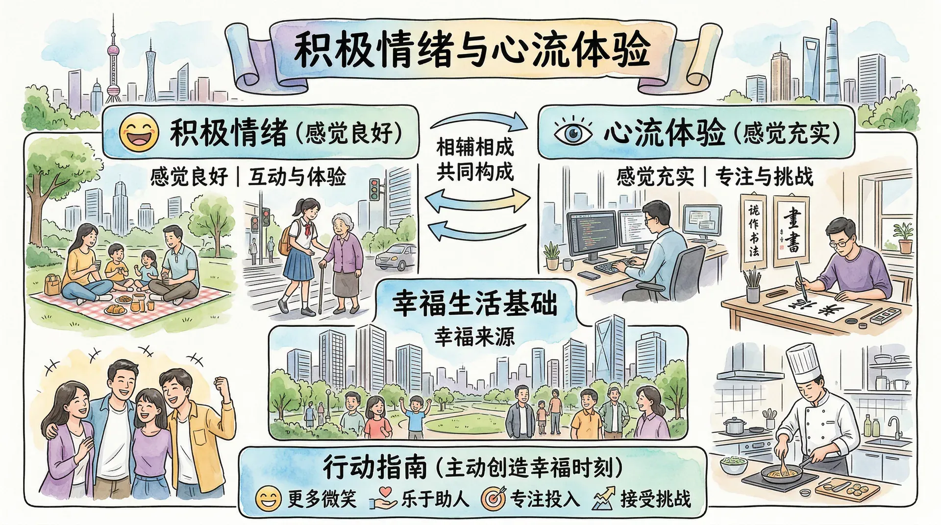 积极情绪和心流体验是日常生活中两种最直接、最真实的幸福来源。积极情绪让人感觉良好,心流体验则让人感觉充实。两者相辅相成,共同构成了幸福生活的重要基础。理解这两者的运作机制,可以帮助我们在日常生活中更主动地创造幸福时刻。