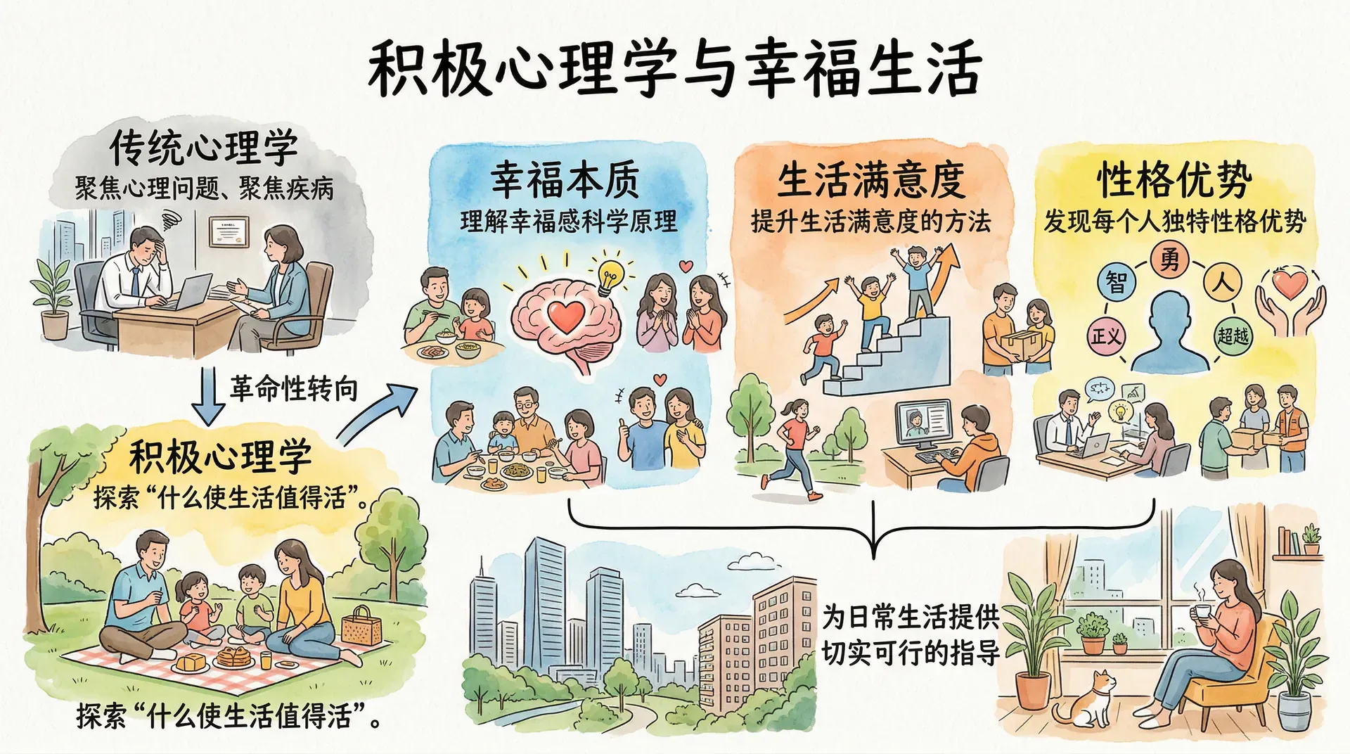 积极心理学是研究人类积极品质、积极情绪和积极体验的科学,它关注如何让个体和社会繁荣发展,而不仅仅是消除痛苦。