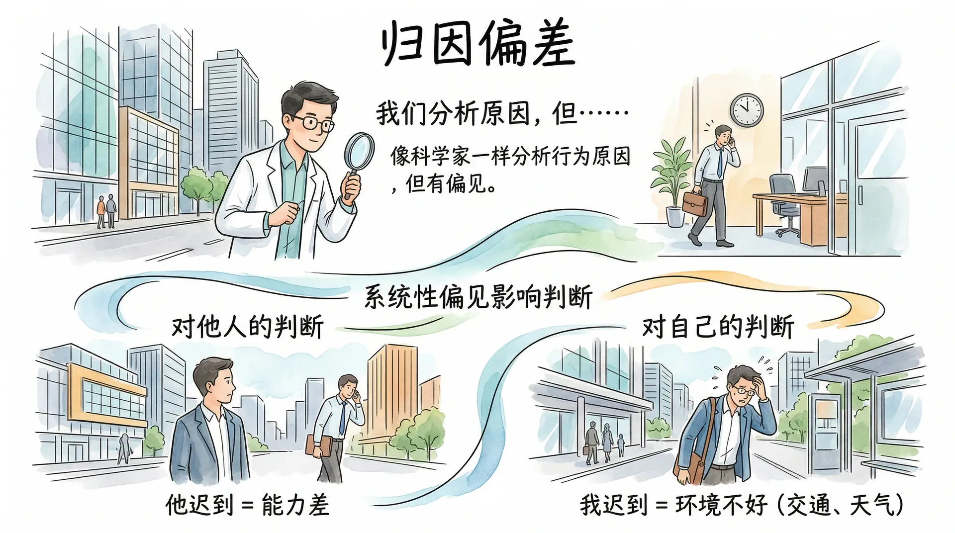 虽然人们像科学家一样分析行为原因,但这个“科学家”常常有偏见。社会心理学发现了多种系统性的归因偏差,这些偏差在不同情境下反复出现,影响着我们对自己和他人的判断。