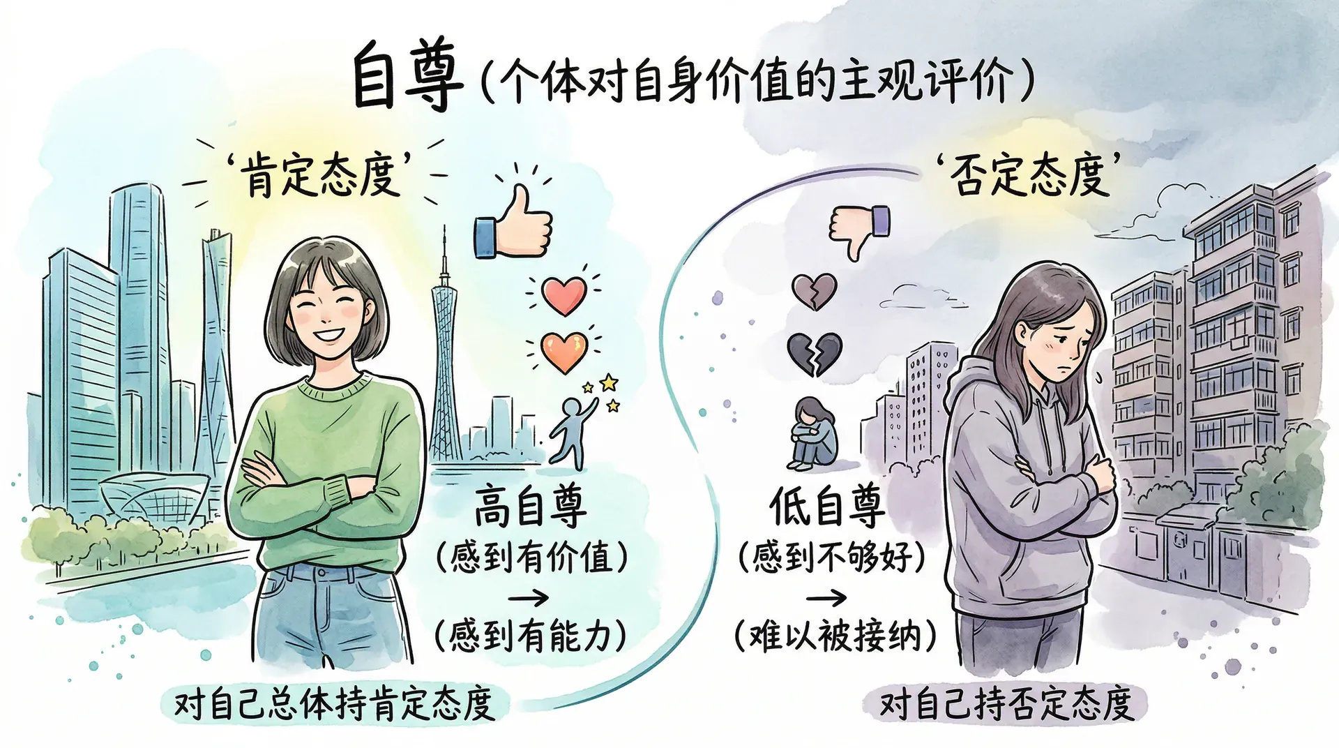 自尊是个体对自身价值的主观评价。高自尊的人对自己总体上持肯定态度,感到有价值、有能力;低自尊的人则对自己持否定态度,感到不够好、难以被接纳。