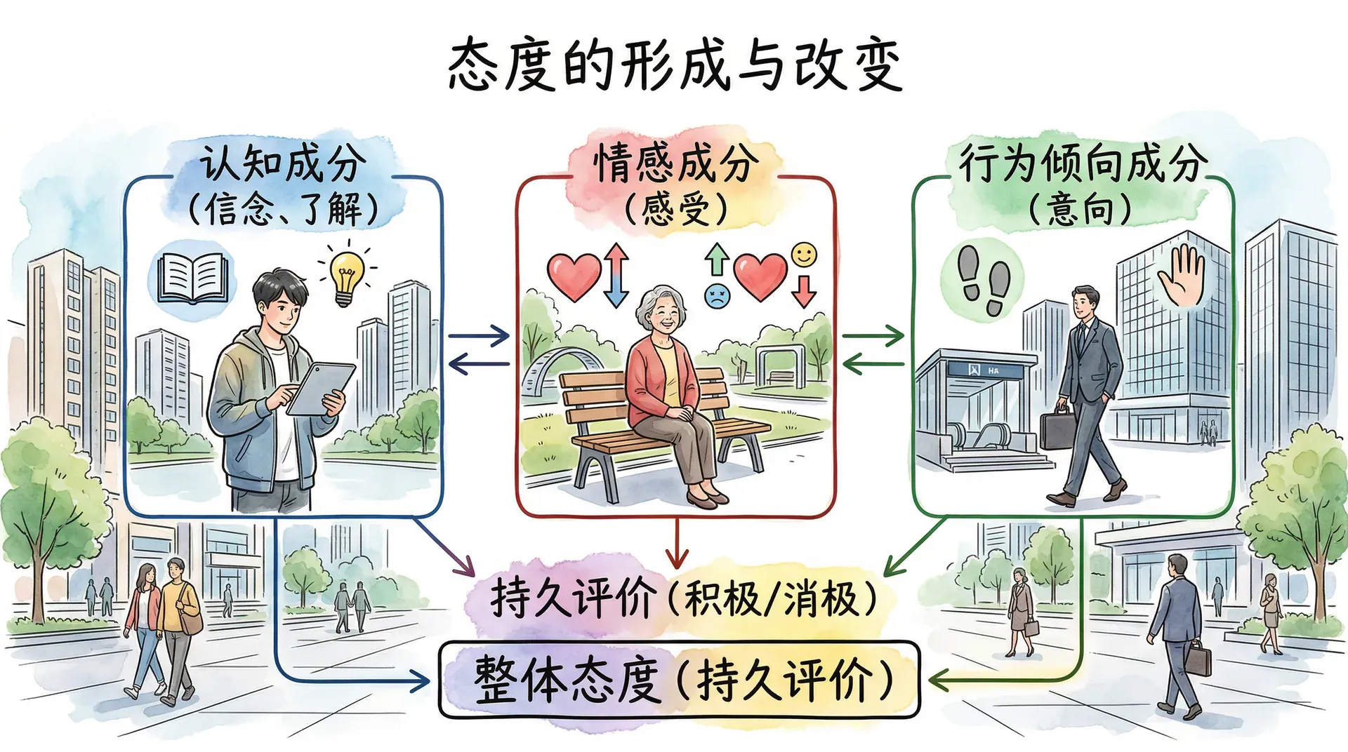 态度是对某个对象持久的积极或消极的评价,包含认知、情感和行为倾向三个成分。认知是对对象的了解和信念,情感是对对象的感受,行为倾向是采取相关行动的意向。三个成分相互影响,共同决定了一个人对某事物的整体态度。