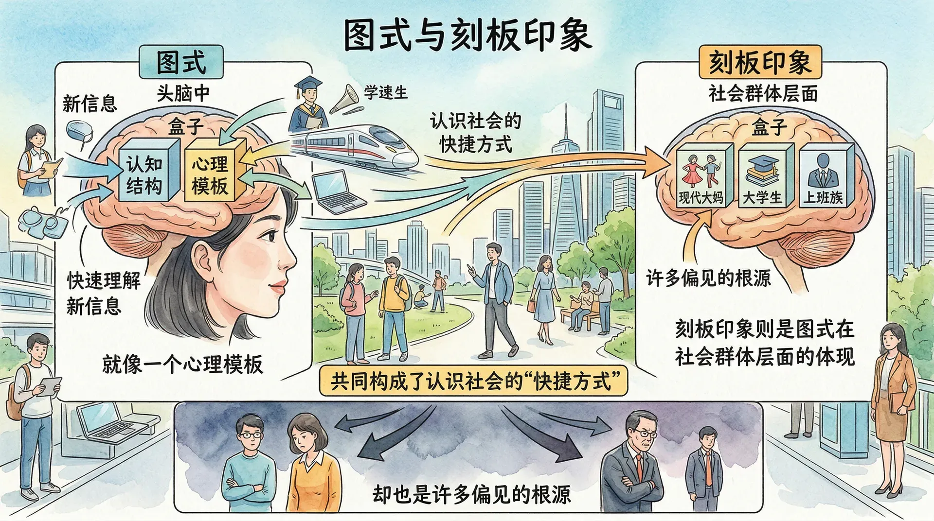 图式是头脑中关于某类人、事、物的认知结构,就像一个心理模板,帮助我们快速理解新信息。刻板印象则是图式在社会群体层面的体现,两者共同构成了认识社会的“快捷方式”,却也是许多偏见的根源。