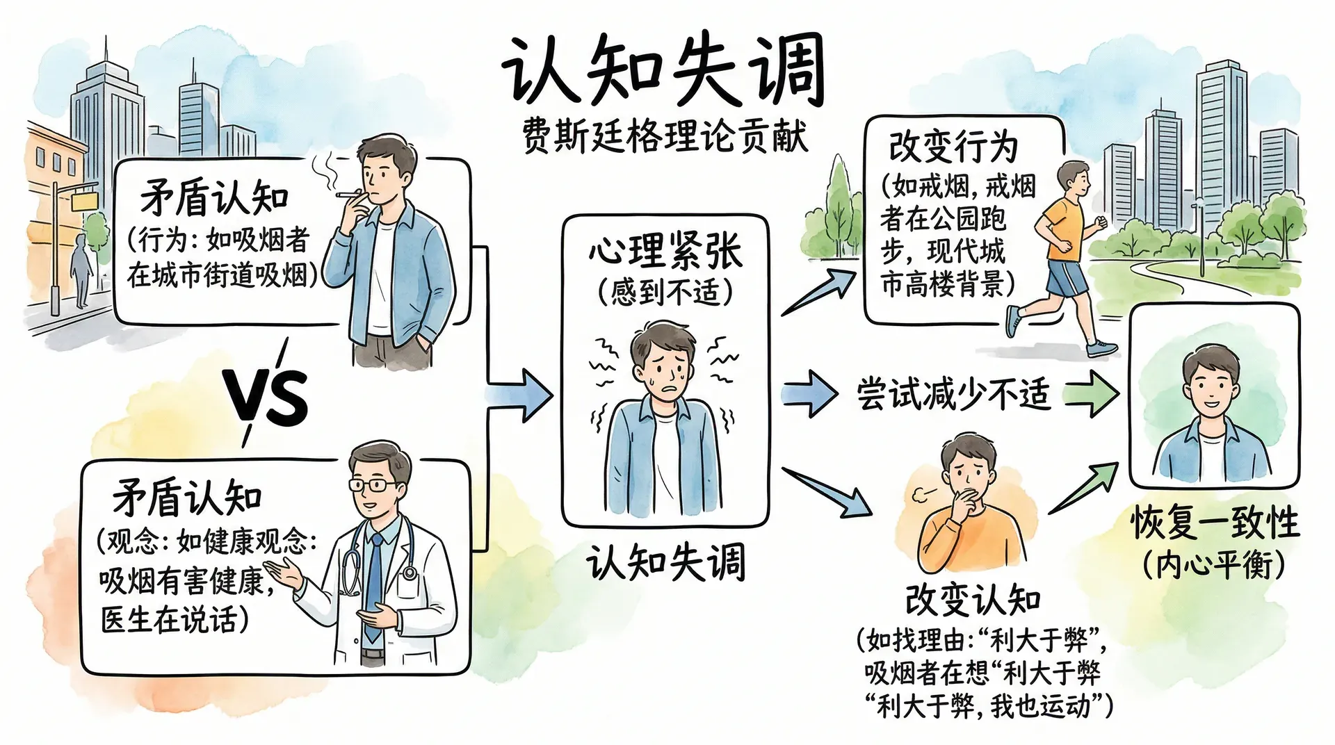 认知失调理论是费斯廷格的经典贡献。该理论认为,当人们持有两个相互矛盾的认知时,会体验到不舒服的心理紧张,即认知失调。为了减少这种不适,人们会改变认知或行为,试图恢复内心的一致性。