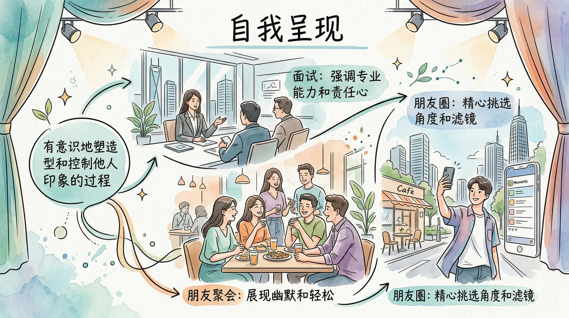 自我呈现是指人们有意识地塑造和控制他人对自己印象的过程。每个人都是“舞台上的演员”,根据不同的场合和对象调整自己的表现。面试时会强调专业能力和责任心,与朋友聚会时会展现幽默和轻松,在朋友圈发照片时则会精心挑选角度和滤镜。