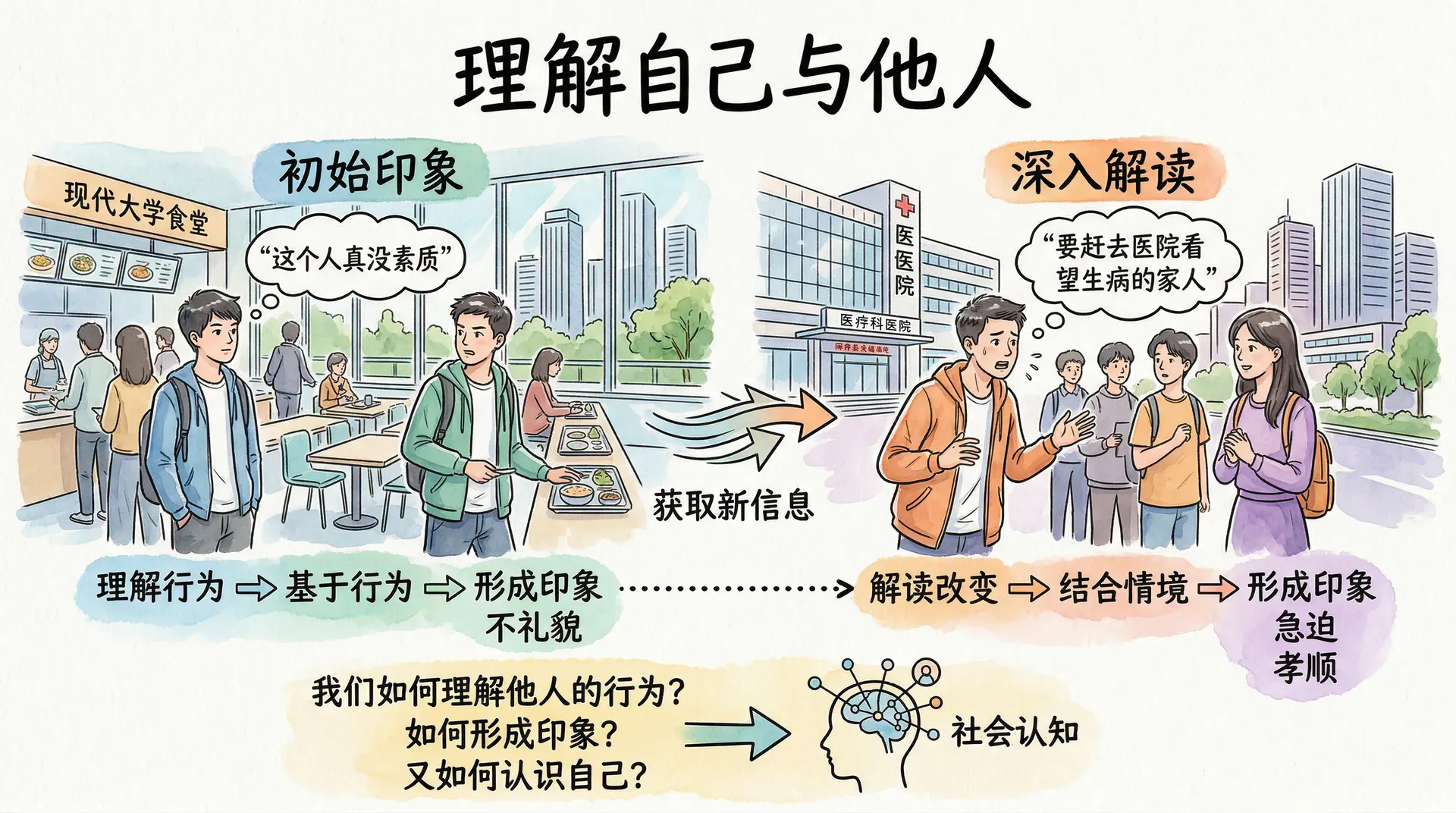 在食堂排队打饭时,前面有位同学突然插队,第一反应可能是“这个人真没素质”。但当得知这位同学要赶去医院看望生病的家人,对他的看法可能立刻改变。这个简单的场景揭示了社会认知的核心问题:我们如何理解他人的行为?如何形成对他人的印象?又如何认识自己?