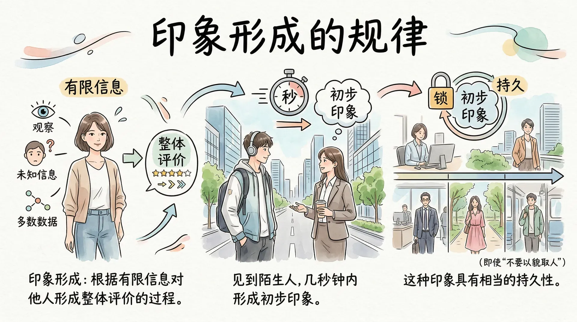 印象形成是指根据有限的信息对他人形成整体评价的过程。虽然常说“不要以貌取人”,但人们往往在见到陌生人的几秒钟内就形成初步印象,且这种印象具有相当的持久性。