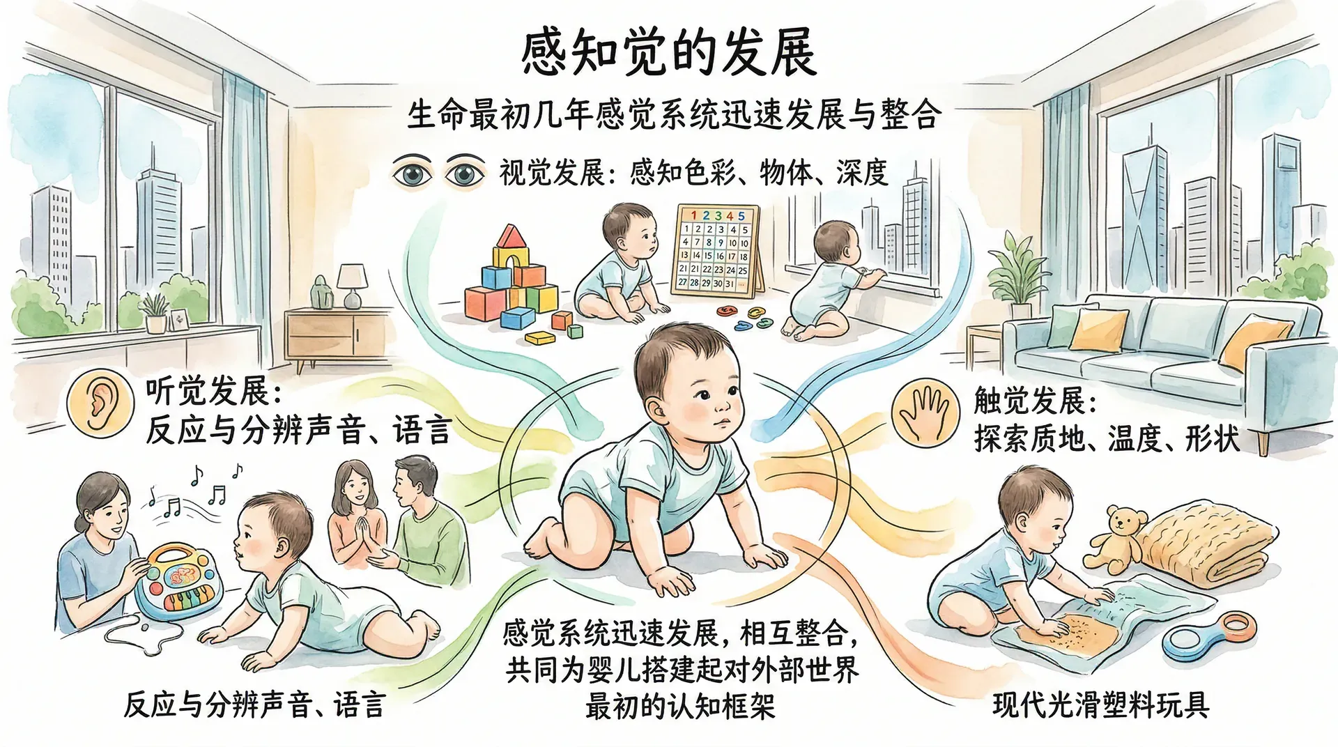 婴儿认识世界的方式,从一开始就是用身体去感受、用感官去探知。在生命最初的几年里,视觉、听觉、触觉等各感觉系统迅速发展,相互整合,共同为婴儿搭建起对外部世界最初的认知框架。