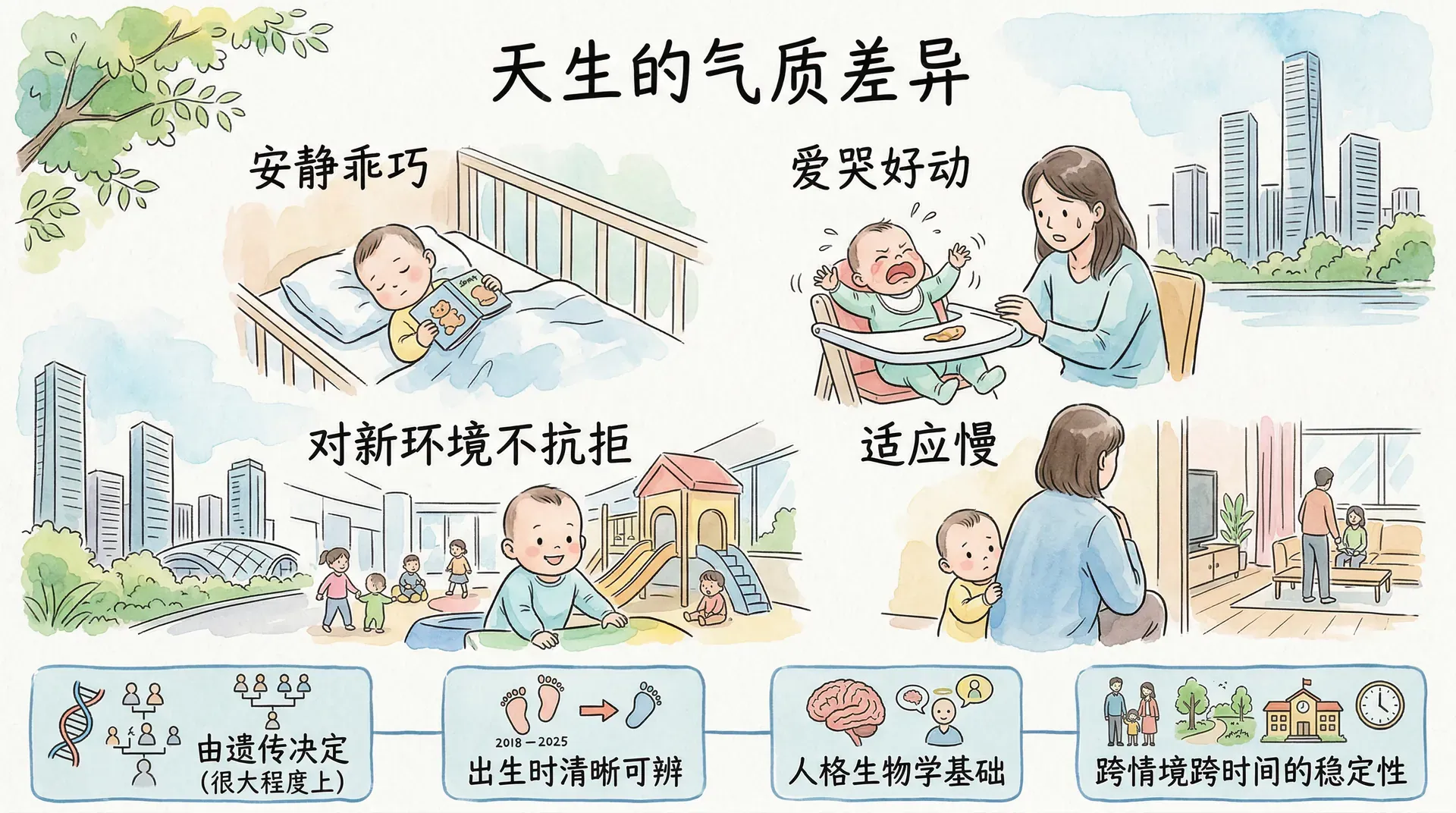 同样是婴儿,有的安静乖巧,有的爱哭好动,有的对新环境毫不抗拒,有的却需要很长时间才能适应。这些差异并非后天教养的结果,而是从出生就清晰可辨的。心理学家将这种天生的行为和情绪反应倾向称为气质,它构成了人格的生物学基础,在很大程度上由遗传决定,且具有跨情境、跨时间的相对稳定性。