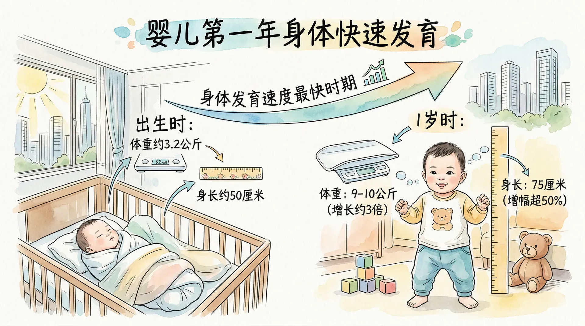 出生后的第一年,是人一生中身体发育速度最快的时期。健康足月儿出生时平均体重约3.2公斤,到1岁时通常增长至9至10公斤,接近出生时的三倍;身长方面,出生时平均约50厘米,1岁时可达75厘米,增幅超过50%。这种惊人的增长速度在此后任何年龄阶段都不会再现。