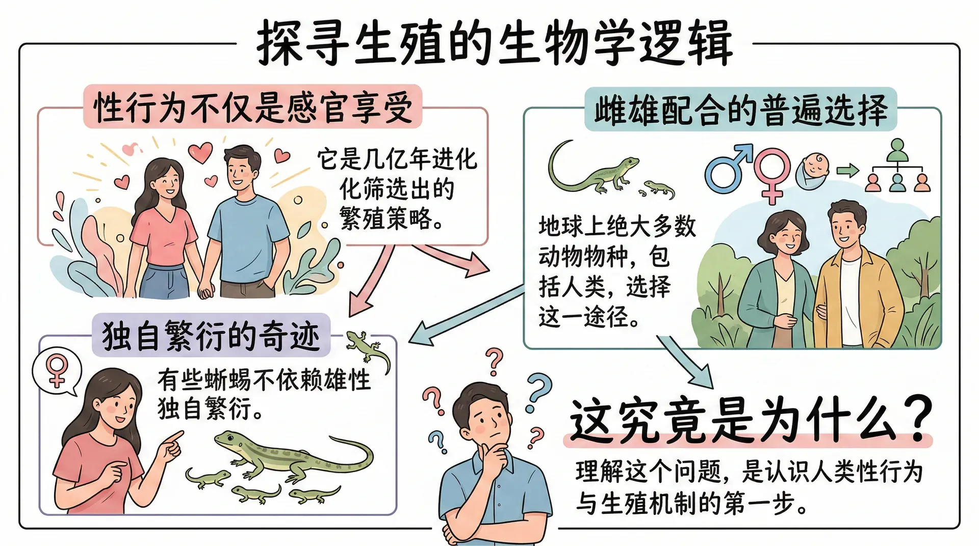 性这个话题,既是人类经验的核心,也是生物学研究的重要领域。从生物学角度来看,性行为远不止于感官享受,它是几亿年进化历程筛选出来的繁殖策略。有些蜥蜴确实可以不依赖雄性独自繁衍后代,但地球上绝大多数的动物物种,包括人类,还是走上了需要雌雄配合的繁殖道路。这究竟是为什么?理解这个问题,是认识人类性行为与生殖机制的第一步。