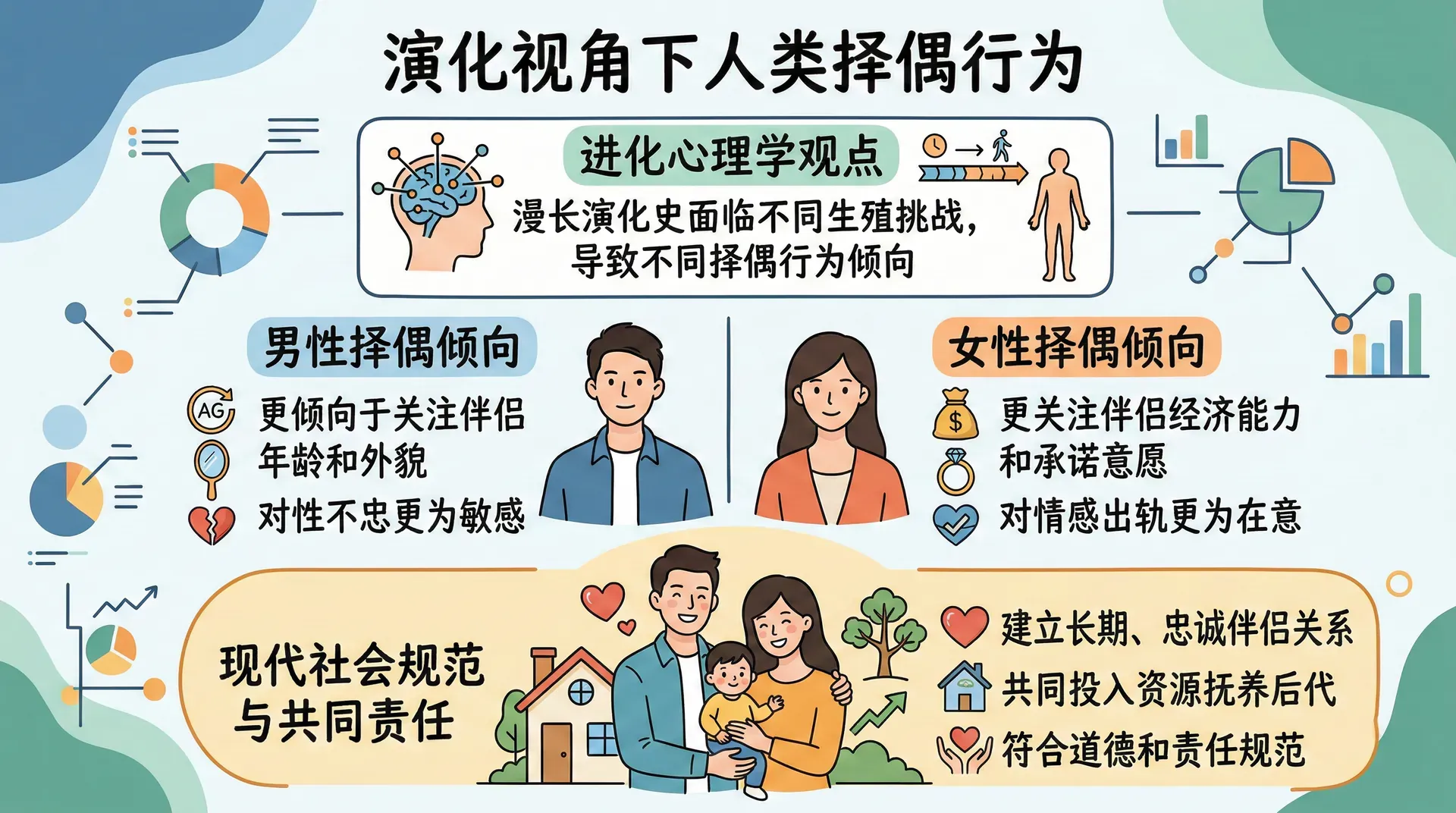 进化心理学认为,男性和女性在漫长的演化史中面临着不同的生殖挑战,这导致了不同的行为倾向。对男性而言,在繁殖策略上理论上曾经存在不同的路径,但从现代社会以及人类道德观来看,男性理应与一位女性建立长期、忠诚的伴侣关系,共同投入资源抚养后代。这种长期稳定的关系不仅有助于后代的成长,也符合当代社会强调的道德和责任规范。